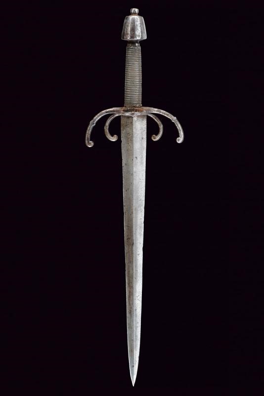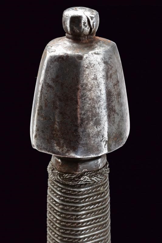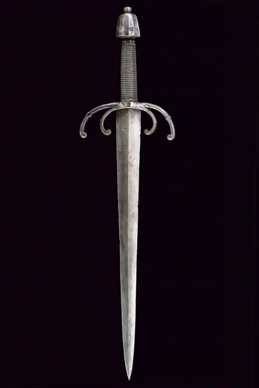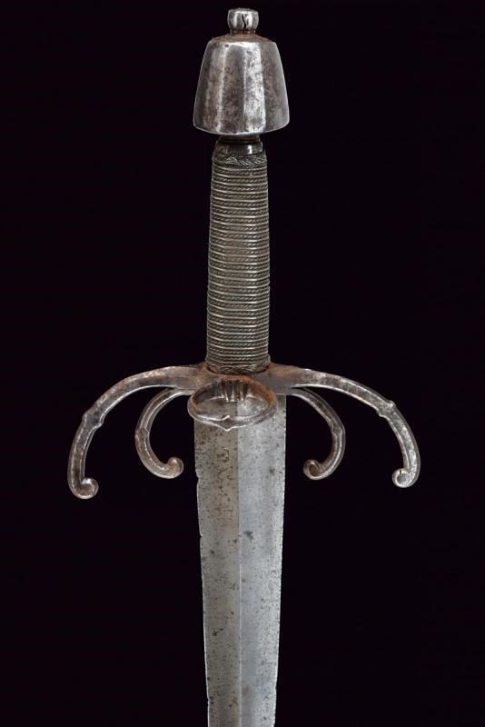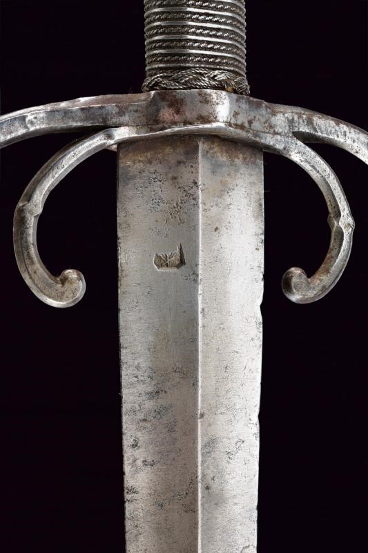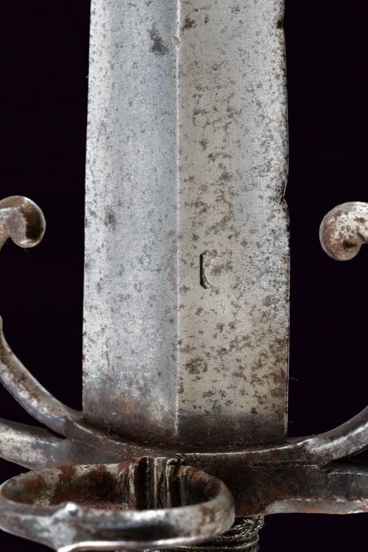 Robusta lama a due fili di sezione a losanga; è presente un punzone su ogni lato, entrambi i marchi solo parzialmente visibili. Fornimenti in ferro con tipico elso a doppi bracci incurvati verso la lama, aventi nodi al centro e riccioli in testa; anello di parata decorato en suite. Pomo trapezoidale faccetto. Impugnatura in legno rivestita con trecciola e dotata di teste di moro in ferro.