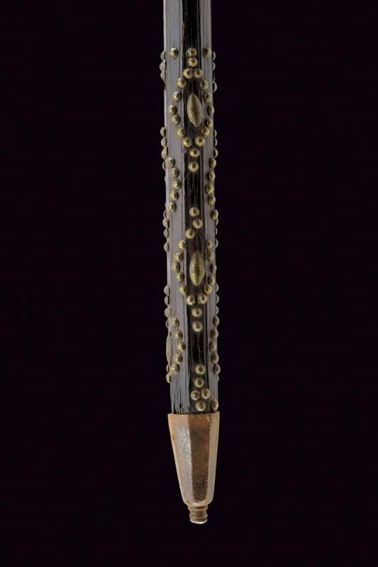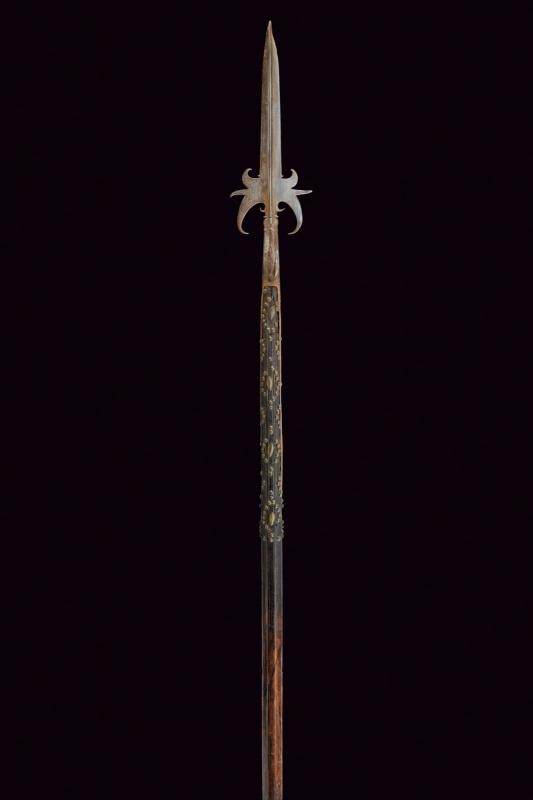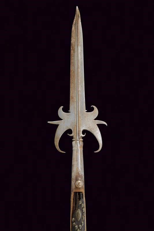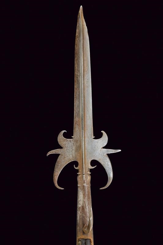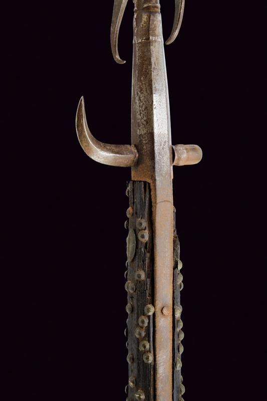 Cuspide a due fili fortemente nervata al centro, con triplici ali alla base e piccoli ganci. Gorbia faccetta con robusto gancio per la lanterna. Bandelle piatte leggermente accorciate, su fusto ligneo antico (piccole mancanze) ornato con rivetti in bronzo alle due estremità; piede in ferro.