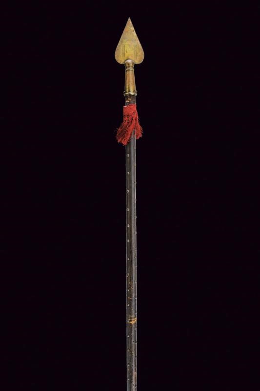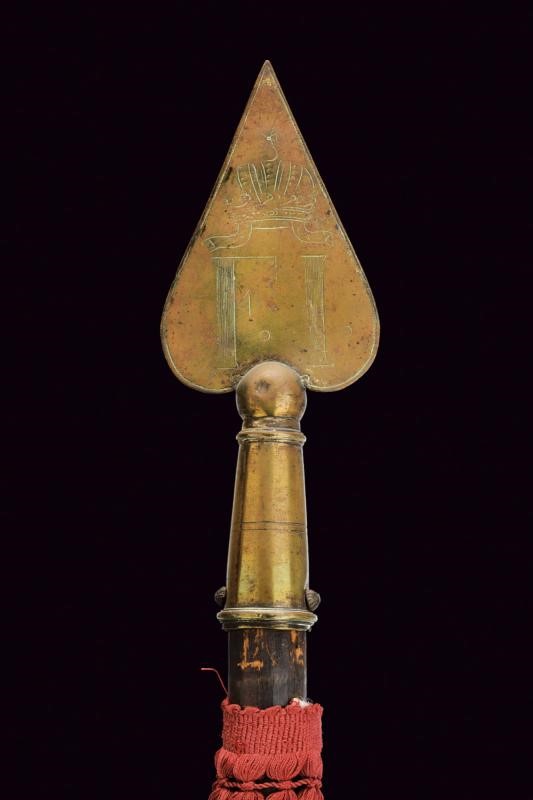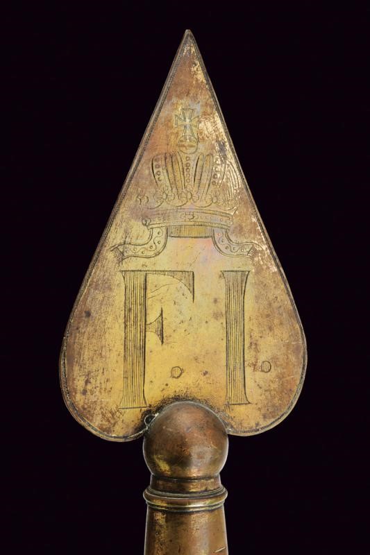 Cuspide a forma di cuore rovesciato, in ottone, con resti di doratura, su entrambi i lati recante il monogramma di Francesco I sotto corona. Nodo a sfera, gorbia troncoconica decorata con anellature alle estremità. Su asta lignea cilindrica decorata con rivetti e munita di nappa moderna.