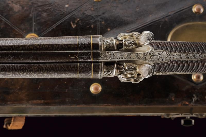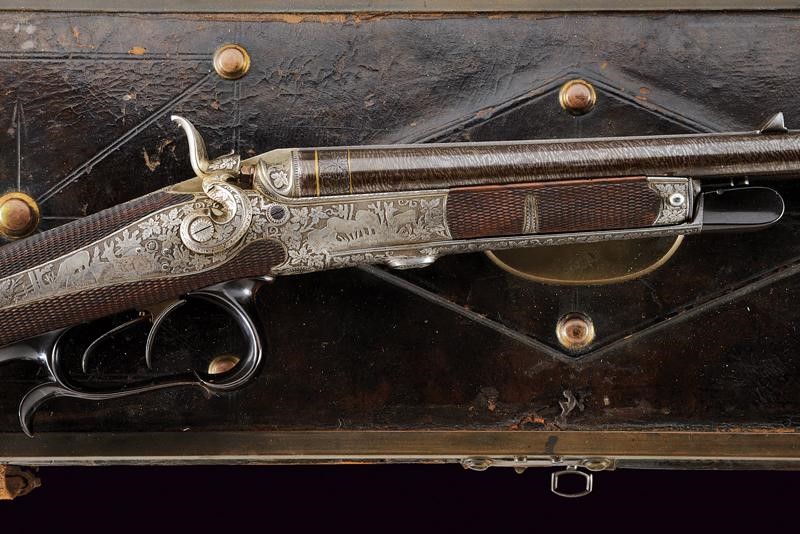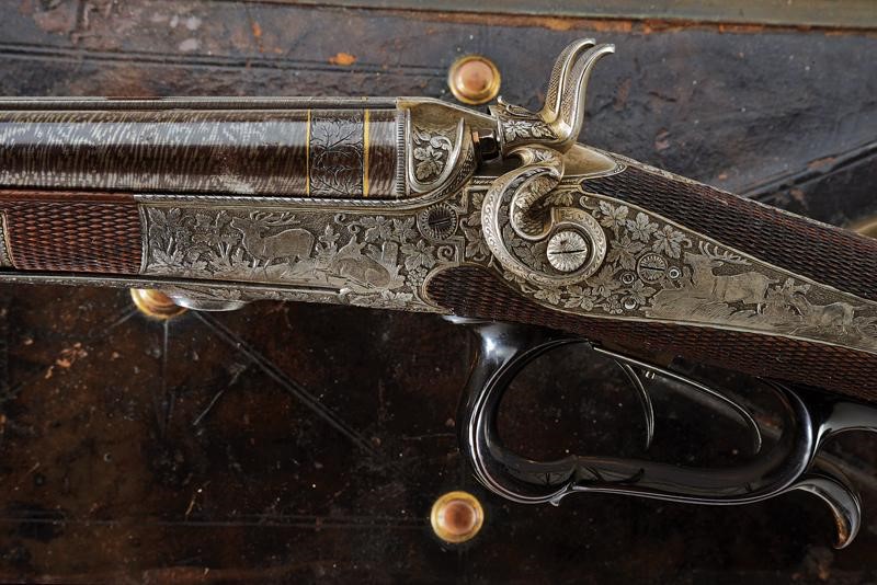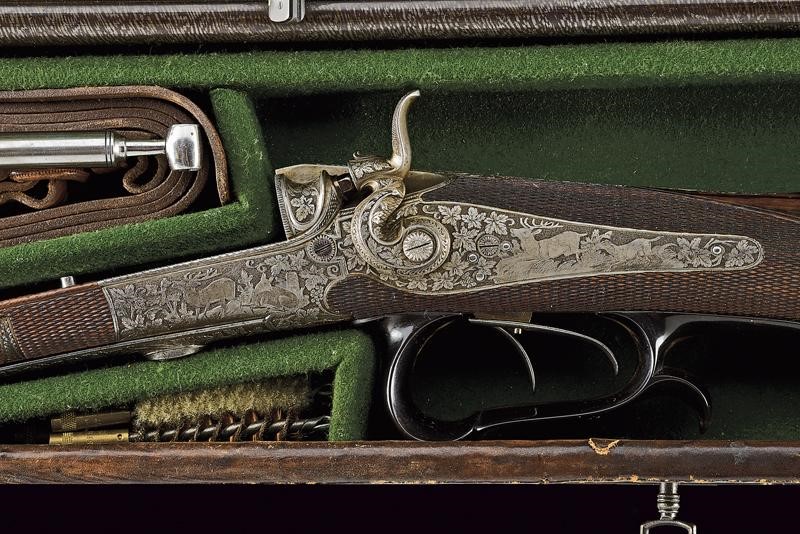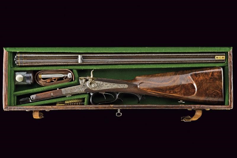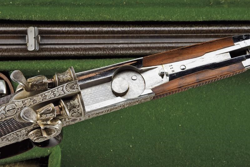Canne rigate, tonde, damascate e brunite, con bindella firmata "A. Haedge Hofbüchsenmacher Berlin", incise alla base con cornice in oro, dotate di alzo, con mirino in argento foderato in osso, cal. 10 mm; lunga codetta incisa; batterie a molla indietro con finissime incisioni di cervi fra racemi, il castello, la leva e gli altri fornimenti incisi allo stesso modo; azionando la leva si alzano le canne, si estraggono le cartucce e si armano i cani; calcio ed astina in radica con zigrinature; ponticello con poggiadito in corno scolpito; sotto alla canna il monogramma "KS" in oro. In cassetta di cuoio foderata internamente di panno verde, con alcuni attrezzi. Bellissima arma di alta qualità del noto armaiolo della corte imperiale.