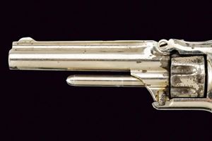 Canna cilindrica con alta bindella dotata di mirino e marcature della ditta con brevetti, basculante verso l'alto, cal. 22 rimfire short. Anima con zone di leggero pitting, rigatura visibile. Tamburo a sette colpi. Il bloccaggio non perfetto. Meccanica funzionante. Resti di nichelatura antica. Guancette lisce in legno di rosa. Matricola "64xxx".