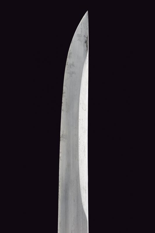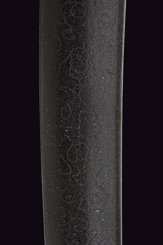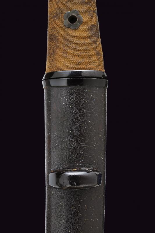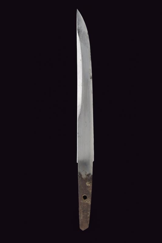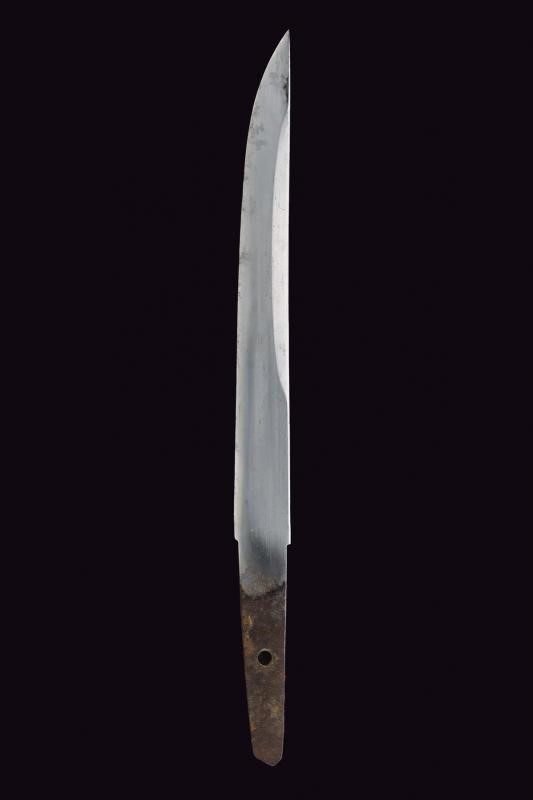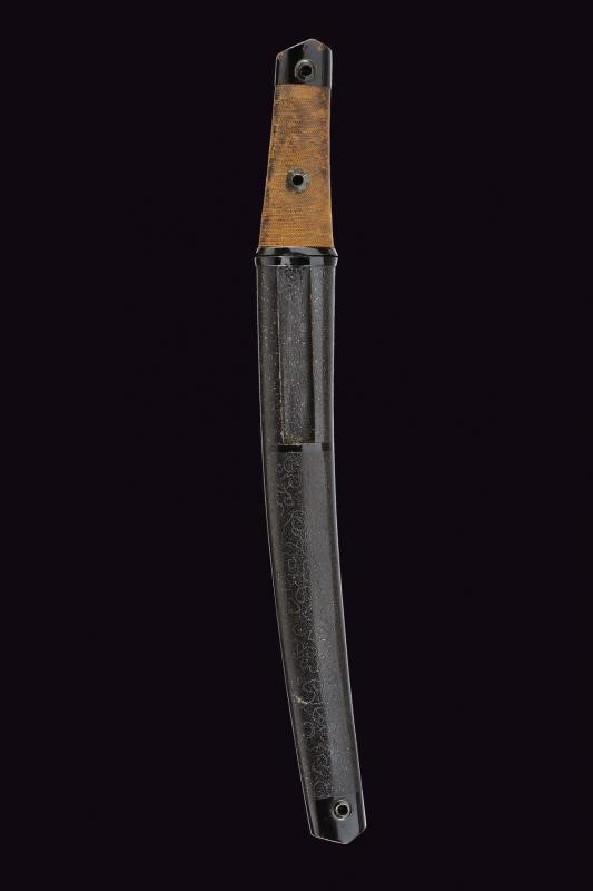Lama (Nagasa di 22 cm) con hamon e hada non visibili; zone con danni e piccoli difetti dovuti alla ruggine (necessaria pulizia); habaki in bronzo inciso. Nakago mu-mei, con un mekugi-ana. Saya laccata di nero con Ishime-nuri (texture di pietra grezza), finitura lucida su Koiguchi, Kojiri e Kurikata.