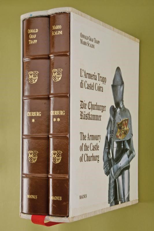 "L' armeria Trapp di Castel Coira - Die Churburger Rustkammer - The armoury of the Castle of Churburg". 2 Vol. Rilegatura con lavorazione manuale della copertina, dorso in pelle con impressioni in oro, cofanetto cartonato rivestito in tela. Vol. I°: ristampa anastatica dell'ed. del 1929, 516 pag. con 72 ill. in bicromia, testo inglese. Vol. 2°: 404 pag., 610 ill. a colori e bicromia, testo italiano, inglese e tedesco. Copie nr. 522 di 2000 esemplari, Magnus Edizioni.