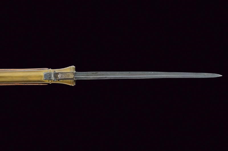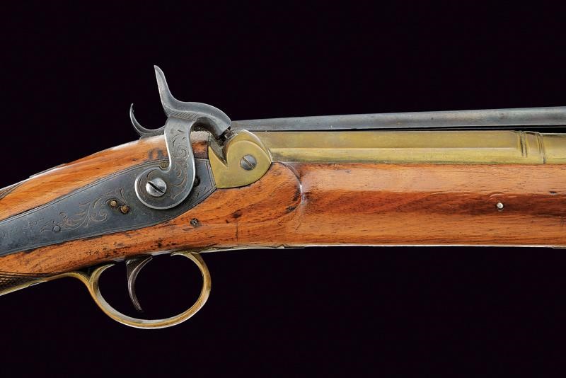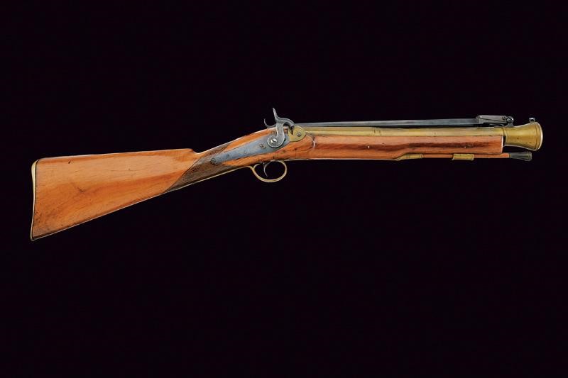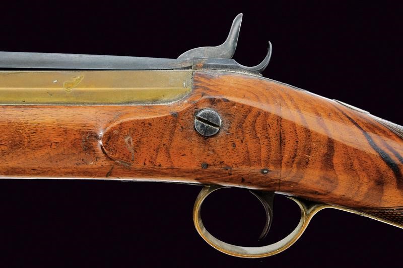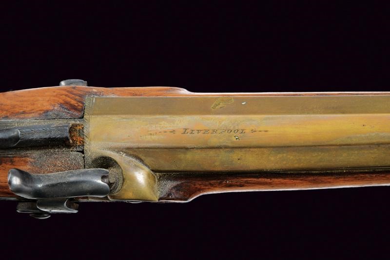 Canna in bronzo a tre ordini, con base ottagonale firmata "LIVERPOOL"; volata strombata e con gioia di bocca; al dorso baionetta a scatto funzionate. Codetta con bottone di rilascio. Batteria a luminello a molla indietro, firmata "BLISSET" ed incisa a motivi floreali. Cassa intera in legno con collo zigrinato. Fornimenti in ottone decorati en suite; bacchetta in legno con fornimenti in ottone.