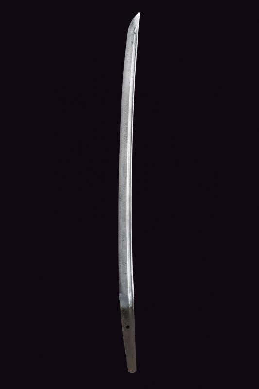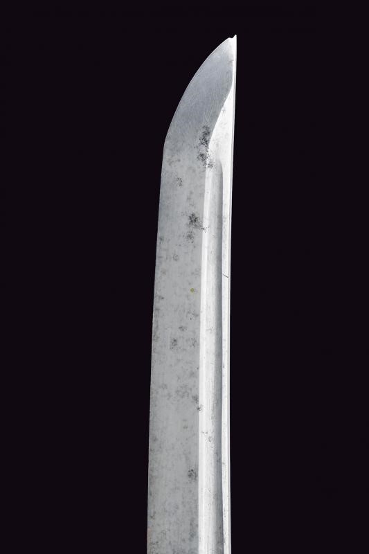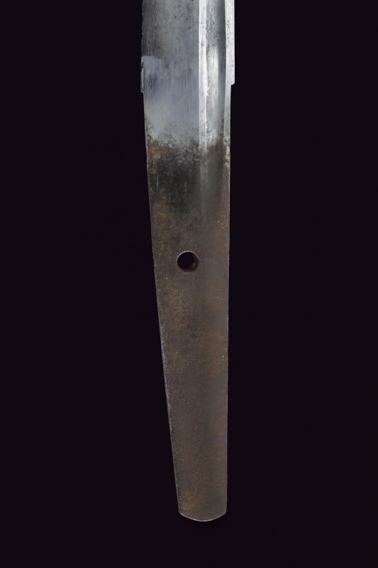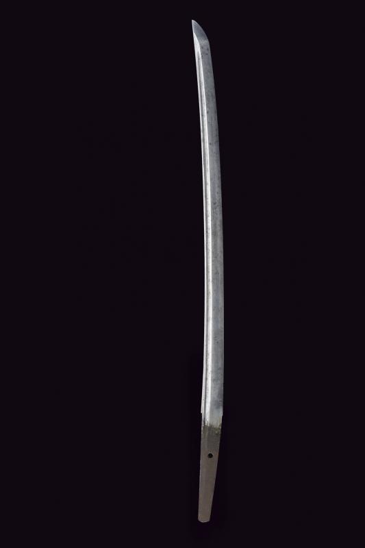 Lama (Nagasa di 53.7 cm) con hamon e hada non visibili, piccole intaccature sul filo e alla punta, scanalatura su entrambi i lati, bel habaki in rame. Nakago mu-mei, con un mekugi-ana. Interessante tsuba in ferro di forma rettangolare con agemine in argento. Fuchi in ferro decorato a onde, kashira in corno, completa di menuki. Priva di saya.