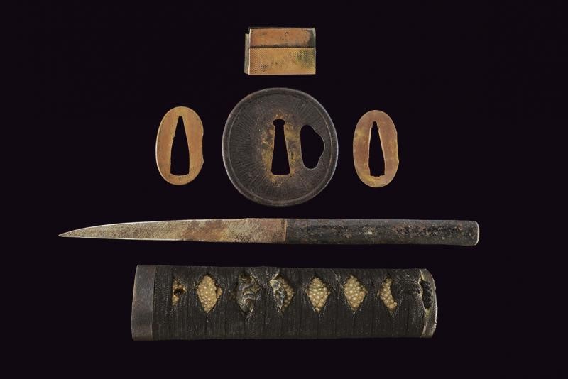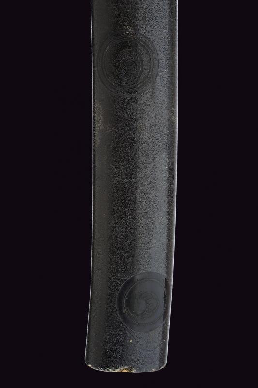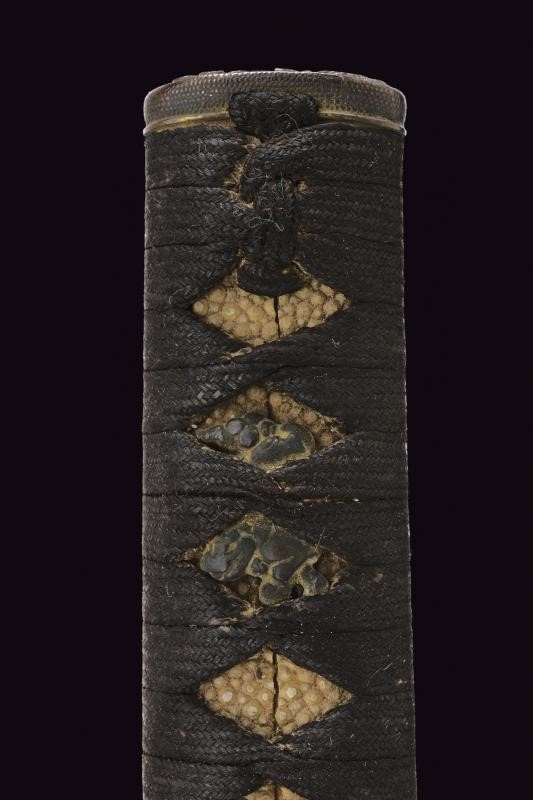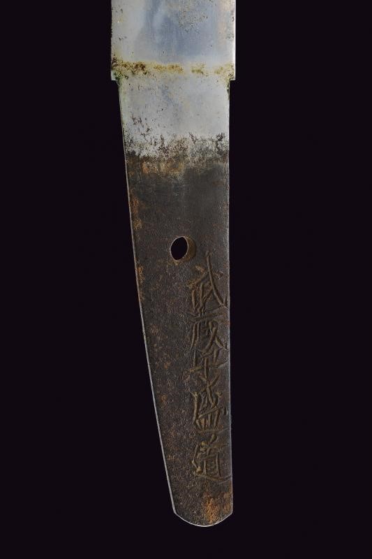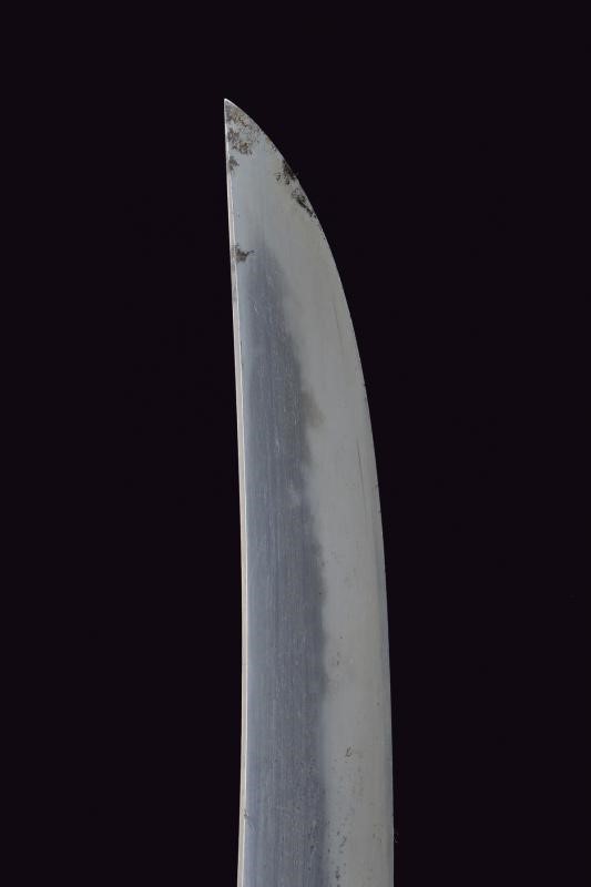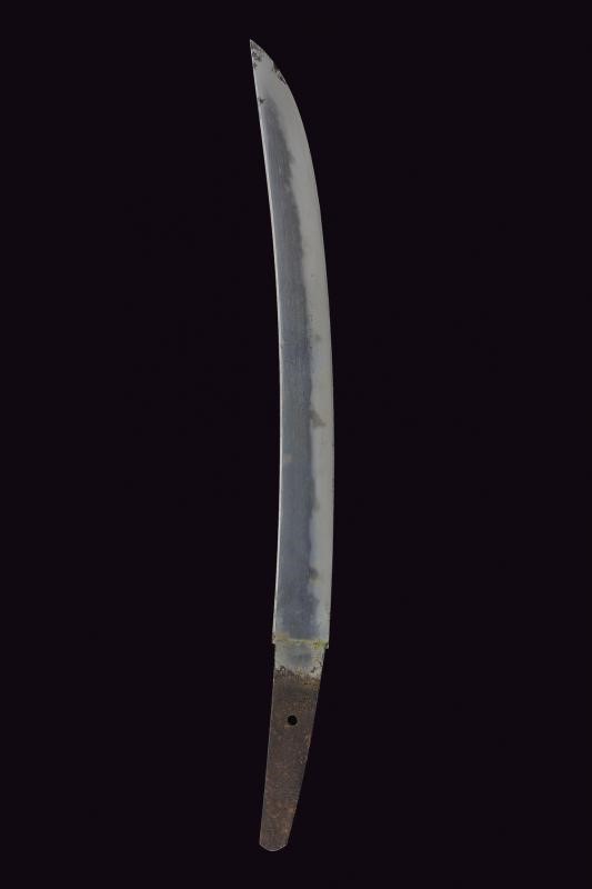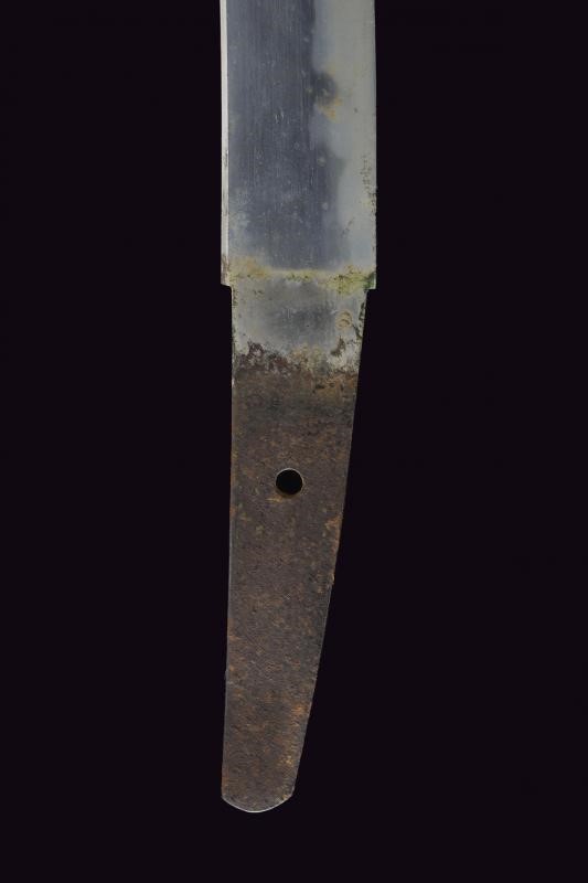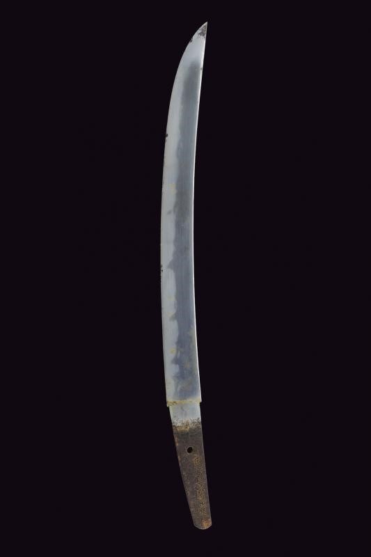 Larga lama (nagasa di 35.2 cm), con piccole zone recanti danni da ruggine. Hamon: Suguha con zone Kataochi; Hada poco visibile, Itame Masame. Doppio habaki in rame. Nagako con un mekugi-ana, mei: "Musashi no Kami Moromichi". Tsuba tate-maru-gata, suki-nokoshi-mimi, decorata a raggi. Fuchi liscio, kashira in rame decorato a motivi floreali in bassorilievo. Menuki anneriti. Saya in lacca nera (mancanze e difetti) decorata con mon. Kurigata in ferro con decorazioni in rame. Semplice kozuka. Shinto, 1625-1660.