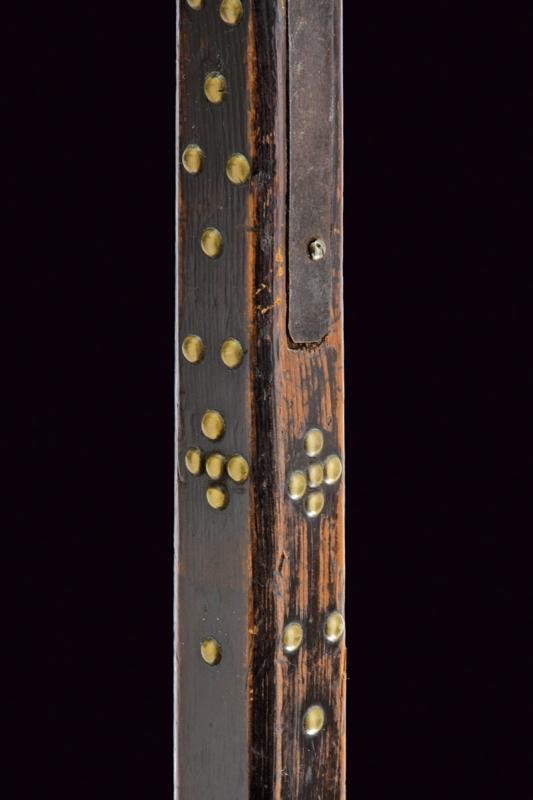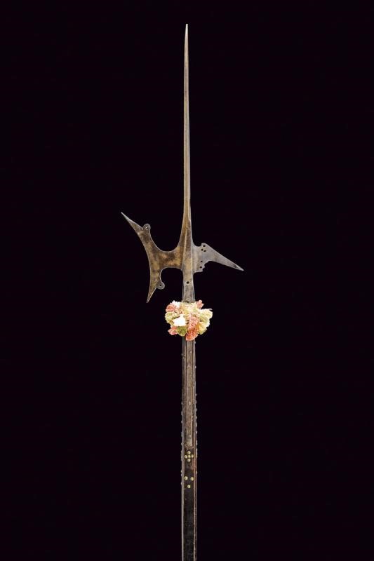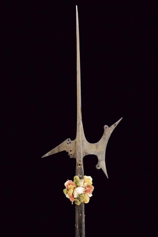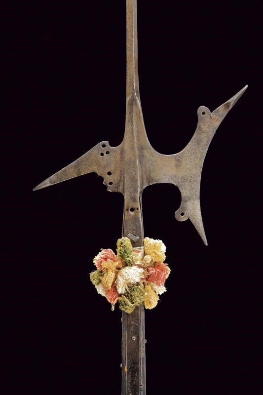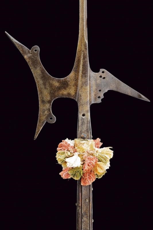 Lunga cuspide di sezione a losanga. Scure a taglio concavo con due gobbe traforate, munita di punta superiore rinforzata, come anche la punta del becco. Con bandelle piatte su asta lignea antica decorata con nappa moderna e con rivetti in ottone.