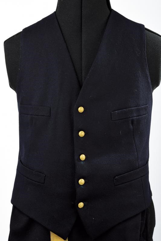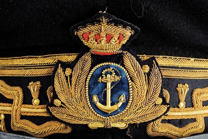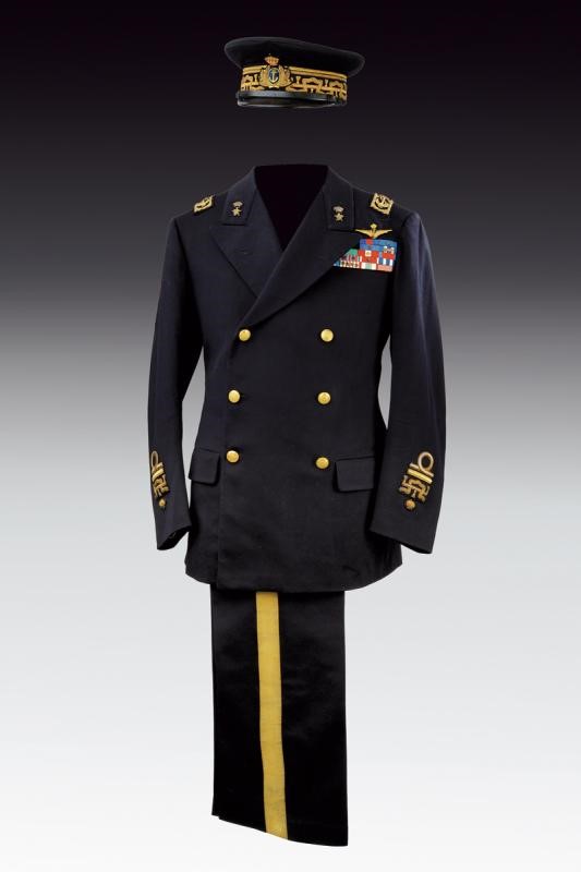 Uniforme ordinaria invernale da ammiraglio di divisione composta da cappello, giacca, gilet e pantaloni. Tutti i pezzi in panno blu notte, il cappello con banda in canutiglia dorata, il fregio con àncora su velluto blu e sotto corona. La giacca con tutti gli effetti in canutiglia dorata e, oltre a cinque file di nastrini, anche il raro brevetto da pilota di marina (prima guerra mondiale). Bottoni con aquila Sabauda sotto corona e su ancora. Il gilet con bottoni dorati. I pantaloni recanti gallone dorato e con etichetta della sartoria "L. BERETTA & C. SUCC.RI DI A FARE & MILANO-ROMA-TORINO-NAPOLI" con scudo Sabaudo, marcata inoltre on l'iscrizione vergata a mano "No. 2023 Sig. Accorretti. E.".