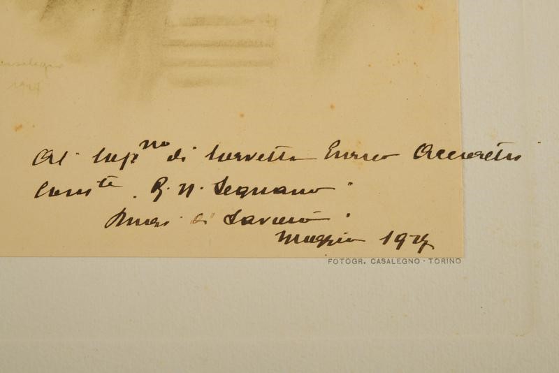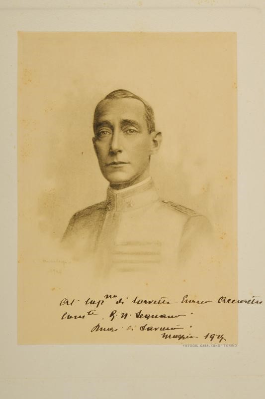 Fotografia di un ritratto del Duca di Savoia con dedica "Al. Cap.no di corvetta Enrico Accorretti Com.te R. N. Legnano. Duca di Savoia. Maggio 1927." Su passe-partout.