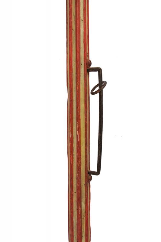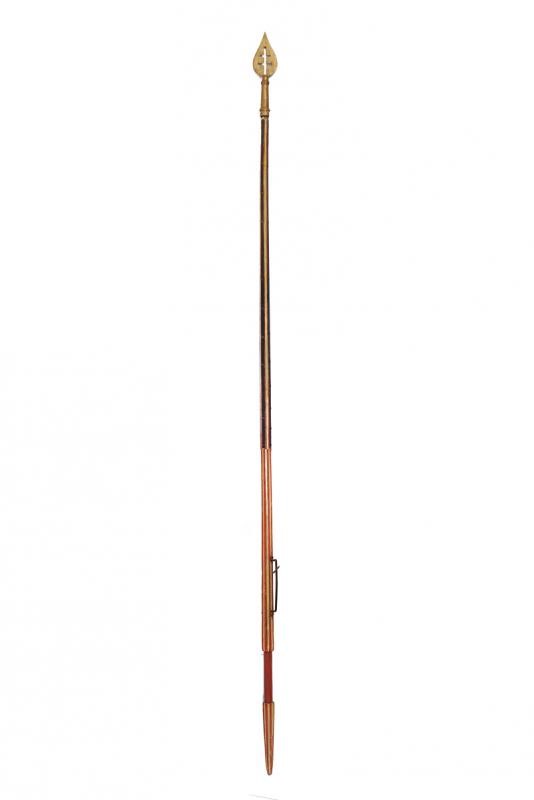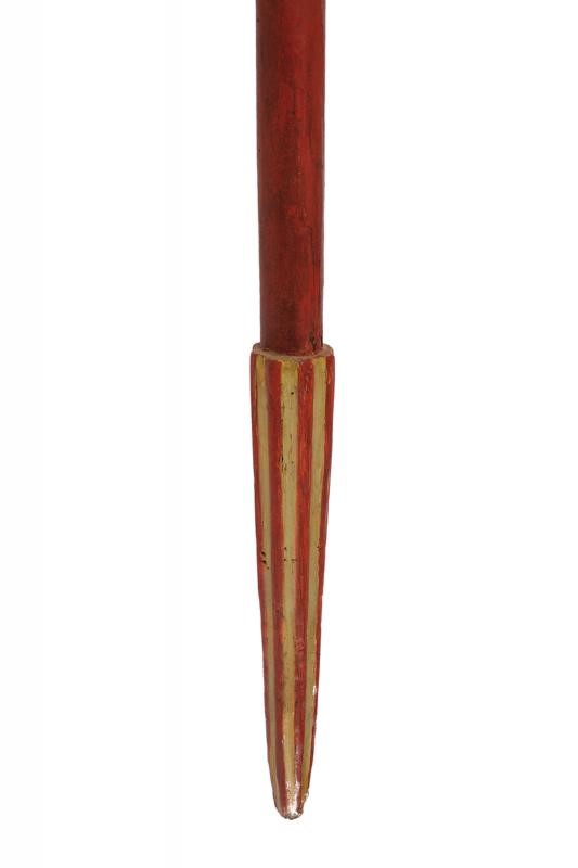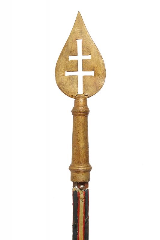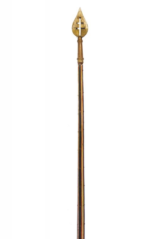 Puntale piatto non affilato, in ferro dorato, traforato con croce patriarcale. Breve gorbia cilindrica. Lunghe bandelle e controbandelle con ribattini. L'asta lignea sul tipo delle lance da giostra, lavorata in legno con lunghe scanalature longitudinali tinte di bianco, il resto della superficie color rosso. L'impugnatura di forma cilindrica e rastremata. Munita di staffa in ferro con anello di sospensione.