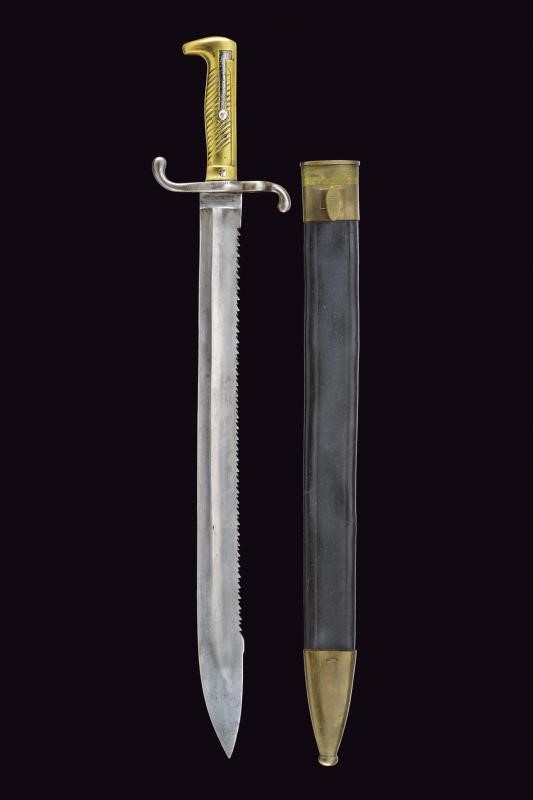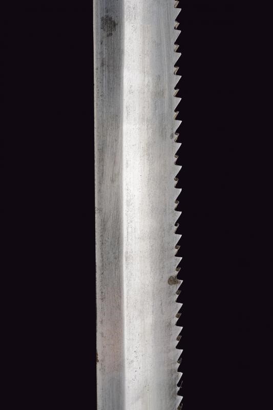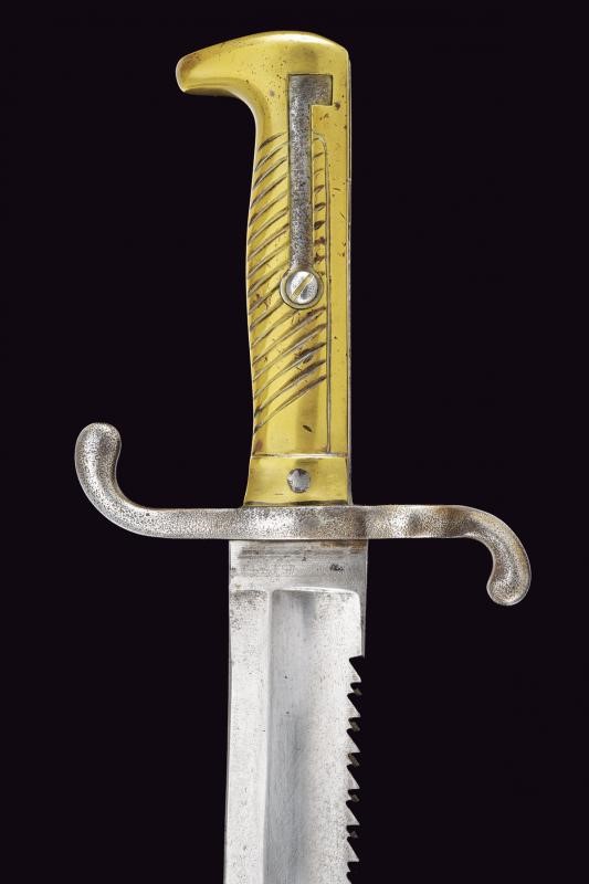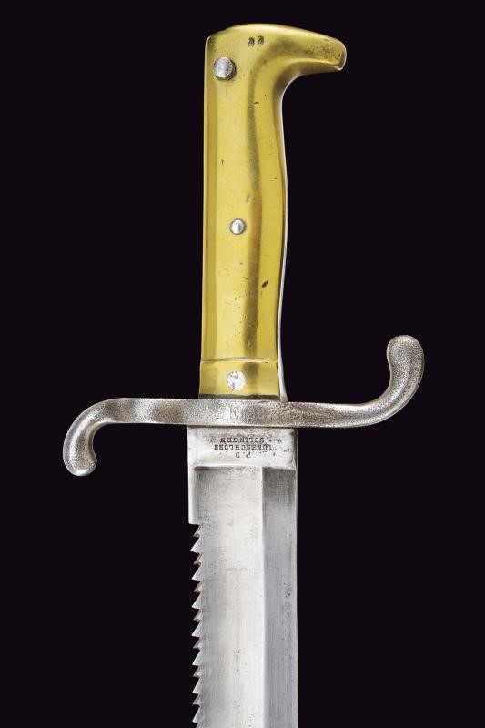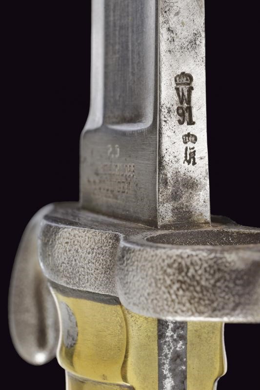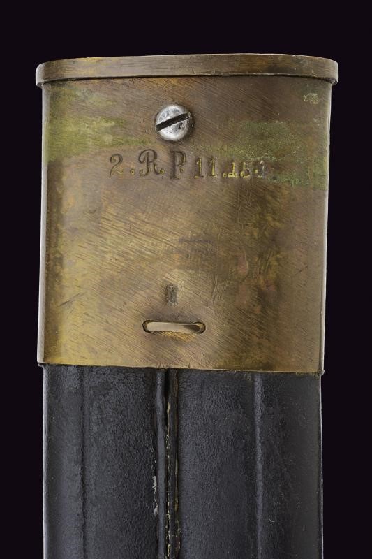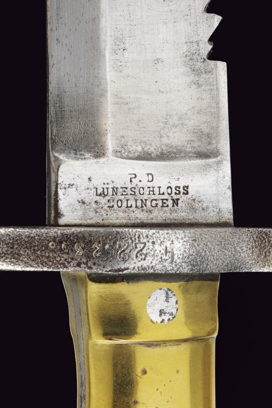 Larga lama dritta, scanalata, con dorso a sega, tallone marcato "P. D. LÜNESCHLOSS SOLINGEN"; fornimento in ferro marcato "E. 22.235", impugnatura in ottone con molla in ferro, punzonata al pomo. Fodero in cuoio con fornimenti in ottone, la cappa marcata "2. R. P.11.154.". Rara.