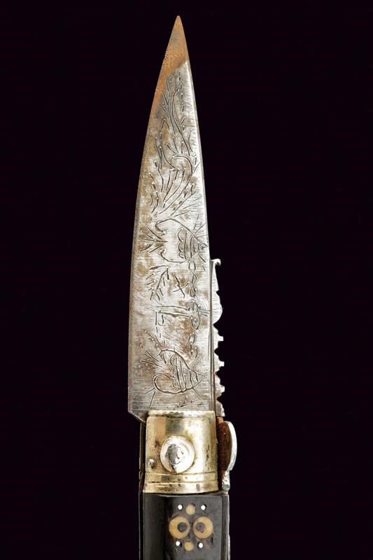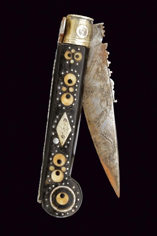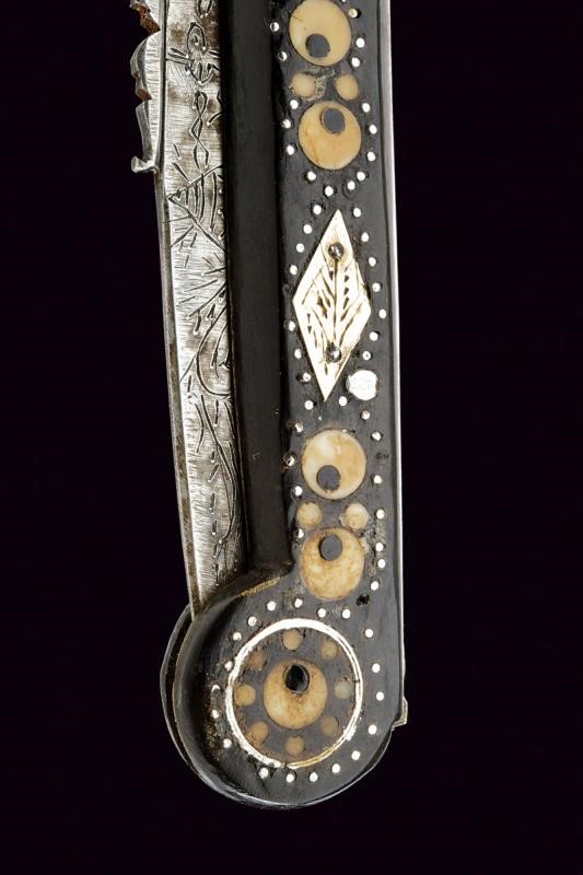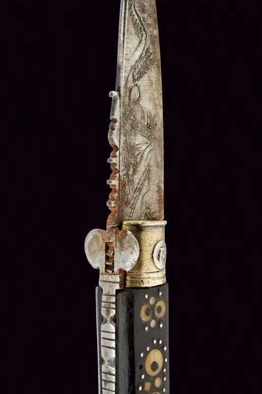 Lama incisa su entrambe le facce, recante da un lato due cuori e una chiave al centro, dall'altra un cuore e semplici disegni a volute. Il dorso con intaglio festonato. Ghiera in metallo bianco. Impugnatura in ebano ornata con occhi circolari in osso con "pupilla" nera, circondati da resti di cornicette a chiodini. Al centro losanghe metalliche incise a racemi. In fondo su entrambi i lati un grande occhio circolare con cornice metallica e a dischetti in osso su un solo lato. Raro.