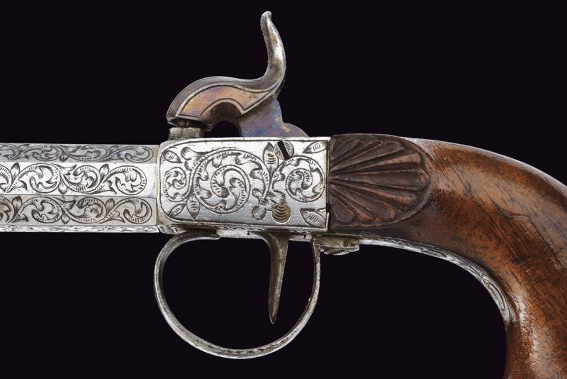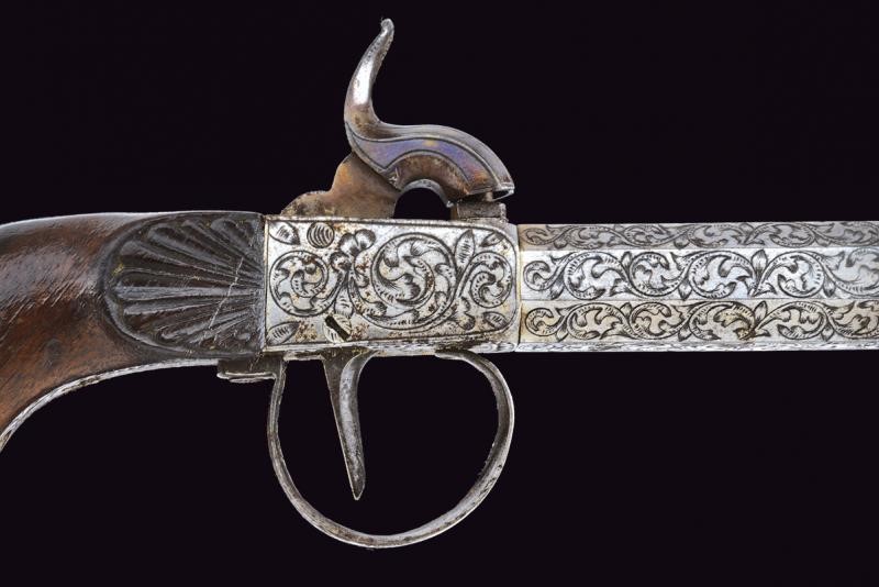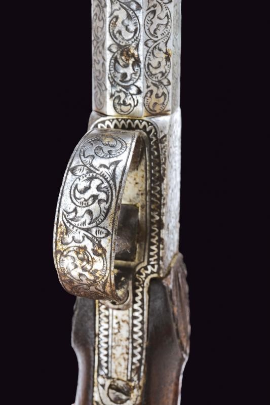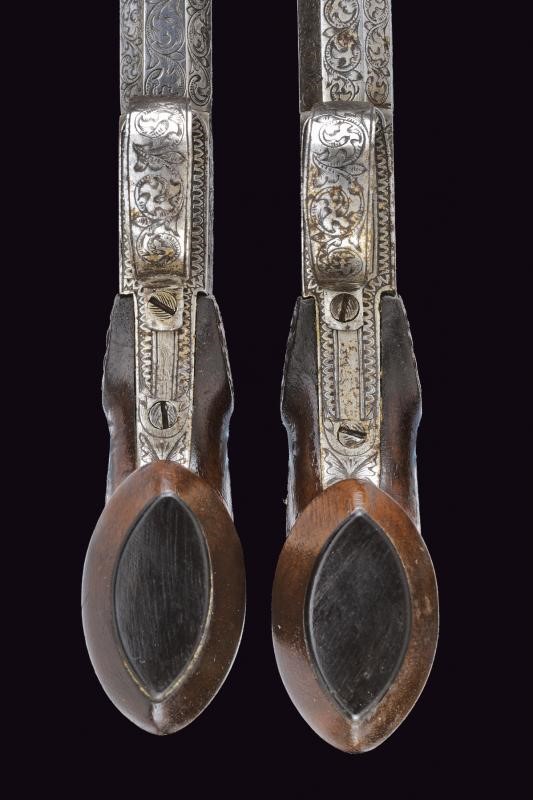Canne ottagonali, lisce e svitabili, aventi tutta la superficie finemente cesellata a racemi; cal 11.8 mm. Castelli del tipo box-lock lavorati en suite. Cani dorsali, centrali e bruniti. Calci in legno con decoro a raggi al castello; scudetto in osso sul dorso. Ponticello inciso nello stesso modo. Uno dei due mazzagatti presenta incrostazioni.