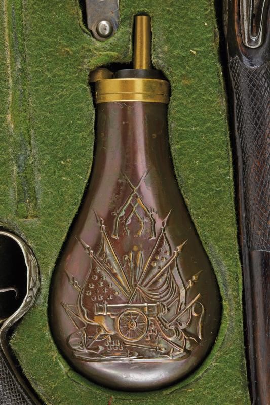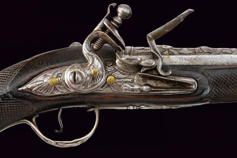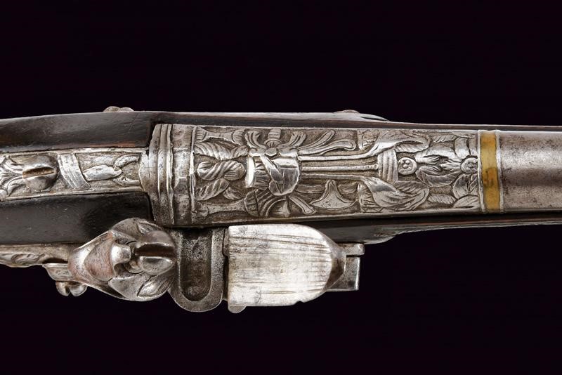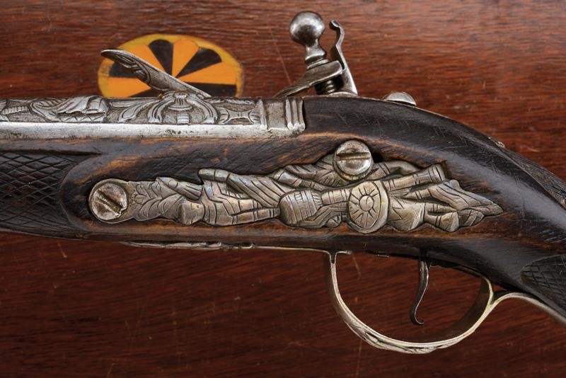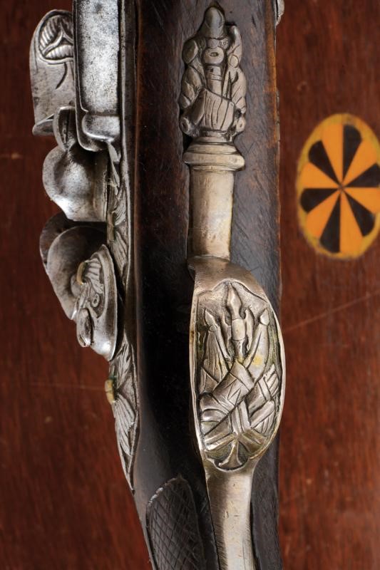 Canne lisce tonde, intagliate nella prima parte, con un trofeo e a motivi floreali in rilievo, poi tonde, con un anellatura rimessa in bronzo al cambio, cal. 16 mm; codette e batterie decorate en suite. Casse intere in legno con astina e collo zigrinati. Fornimenti in argento decorati a trofei in rilievo, le cocce con stella e bottone circolare. Conservate in una cassetta non coeva, insieme a una fiasca da polvere e un fondipalle.