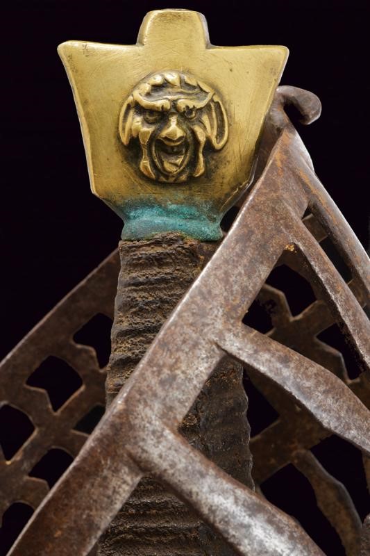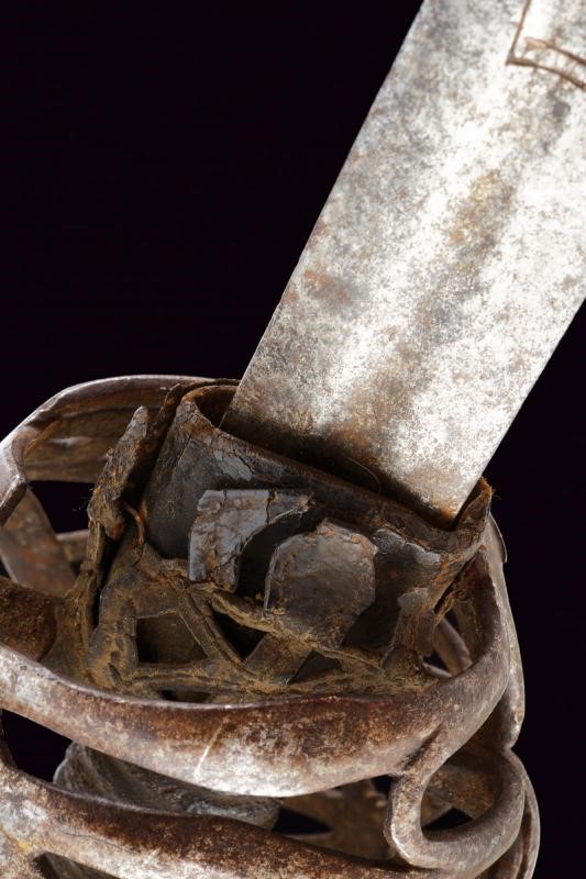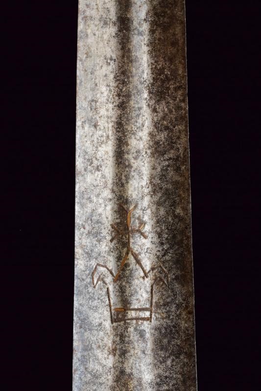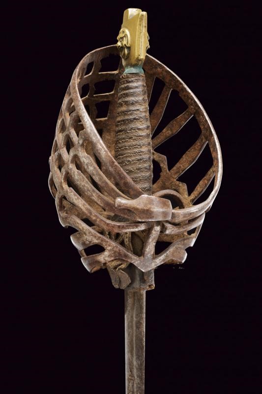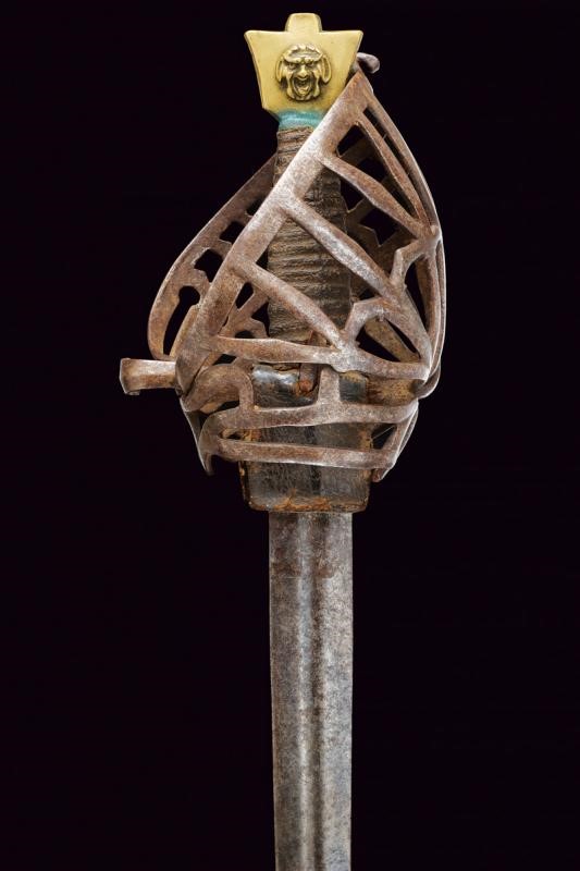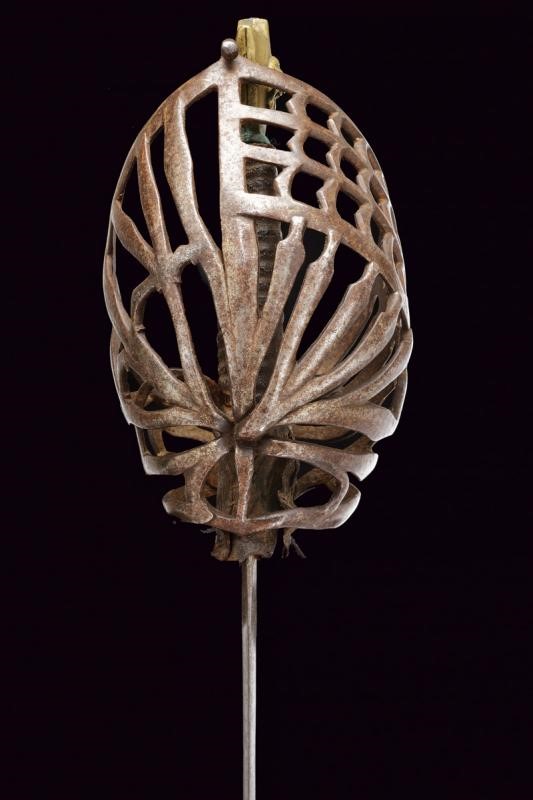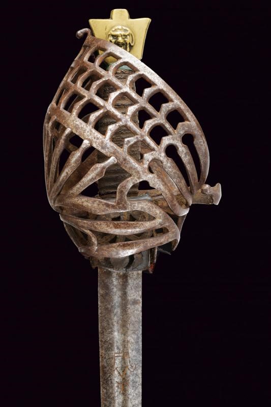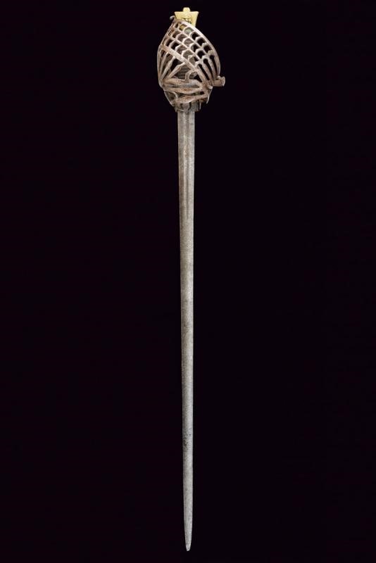 Lama dritta di sezione lenticolare, con scanalatura centrale al forte, recante sul lato di terza incisione di un giglio stilizzato poggiato su una corona (?), la base ricoperta con il cuoio originale (piccoli danni), sul lato anteriore un traforo a ruota. Fornimento a gabbia riccamente traforato e munito di anello da pollice; il pomo in ottone a testa di gatto e con mascherone al centro. Impugnatura in legno con rivestimento originale in cuoio, piccola mancanza.