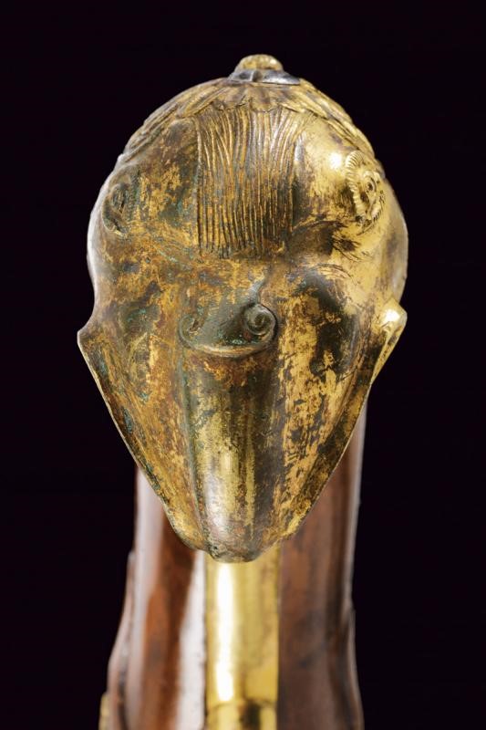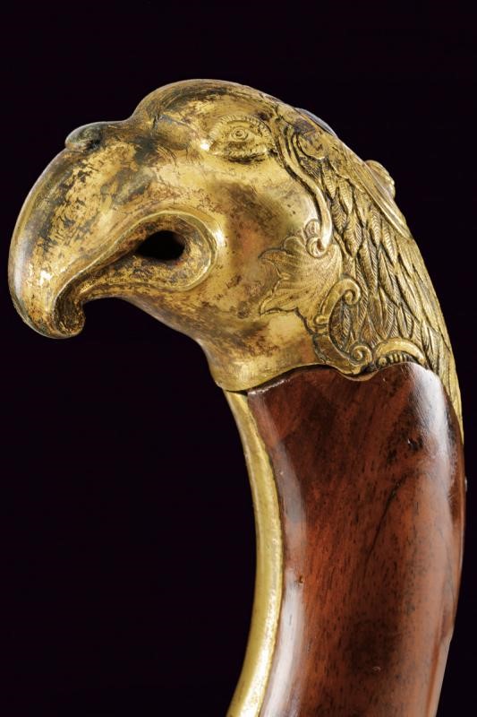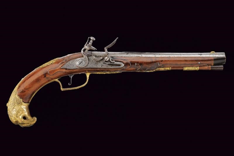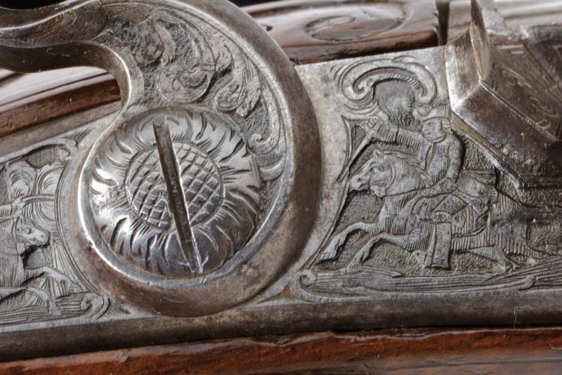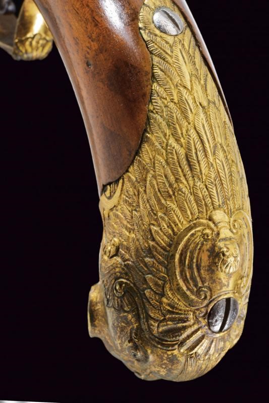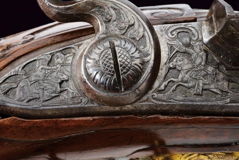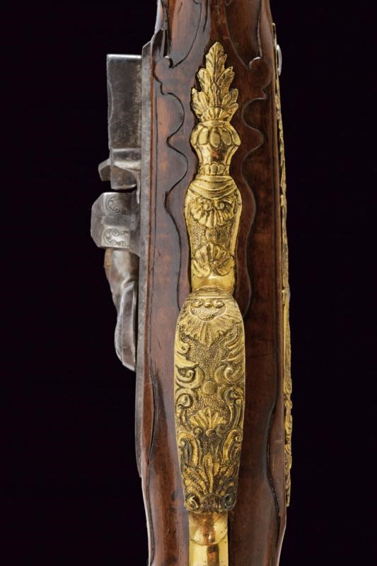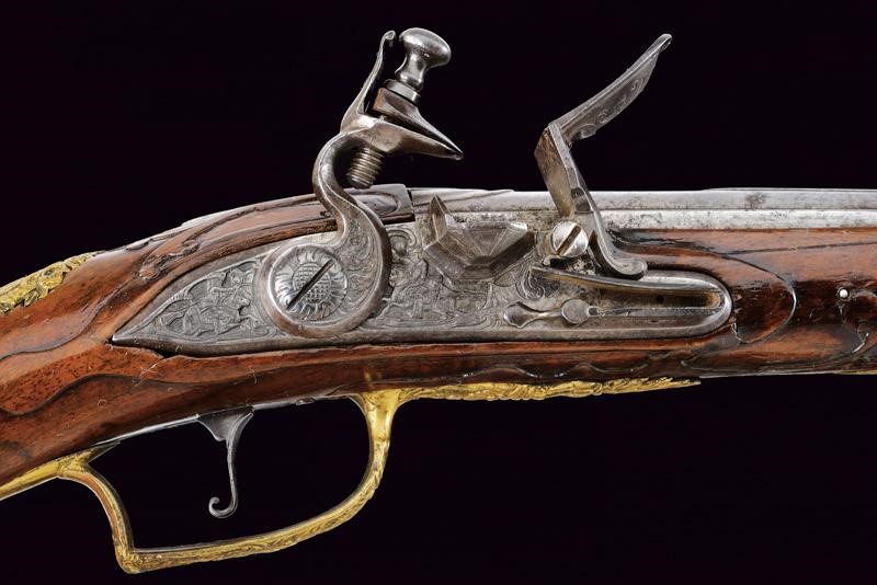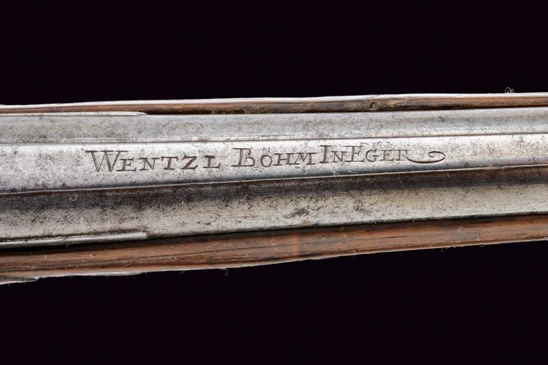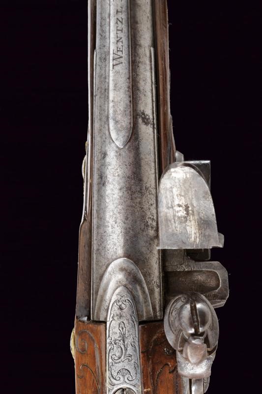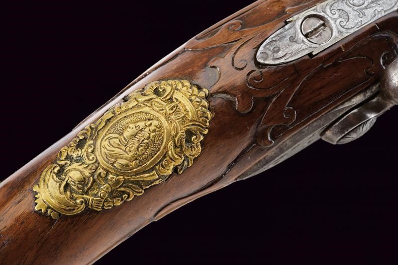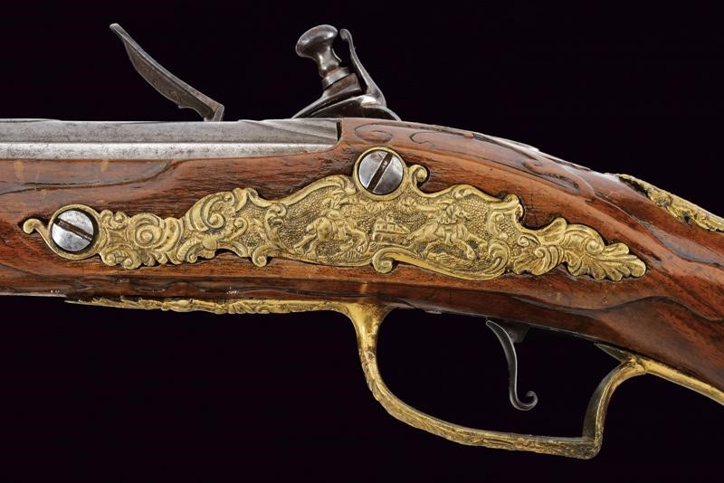 Canna liscia con base intagliata, bindella firmata "WENZL BÖHM IN EGER", dotata di mirino a coda di rondine in ottone, in cal. 13 mm. Codetta finemente incisa. Batteria a pietra focaia, la cartella recante finissime incisioni, con effige di due ufficiali a cavallo all'attacco. Cassa intera in legno (piccoli restauri) leggermente scolpita a delineature. Bellissimi fornimenti in bronzo dorato (mancanze alla doratura), la contropiastra con scena simile alla batteria, Il ponticello a rocaille e motivi floreali, la coccia con testa di aquila a tuttotondo. Bacchetta in legno con battipalla in corno.