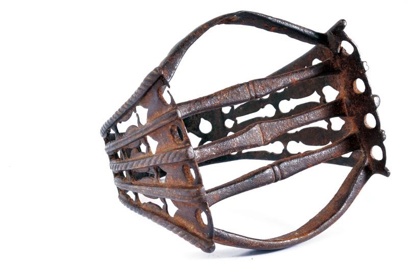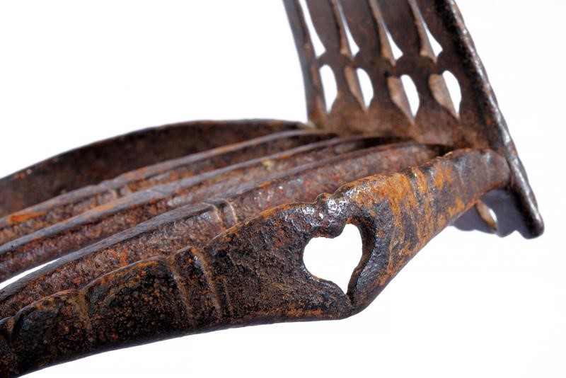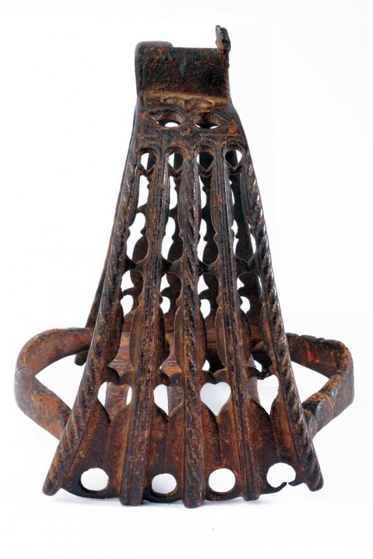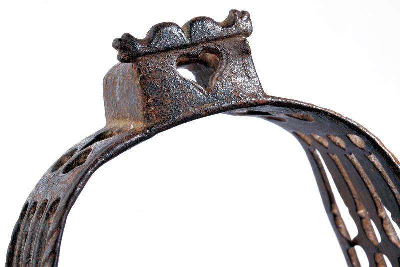 In ferro. Arcata a cinque doghe con trafori a cuore, gocce e cerchi. La panca costituita da cinque barre trasversali, quelle esterne decorate entrambe con un traforo centrale a cuore. Anche l'occhio decorato con un cuore.