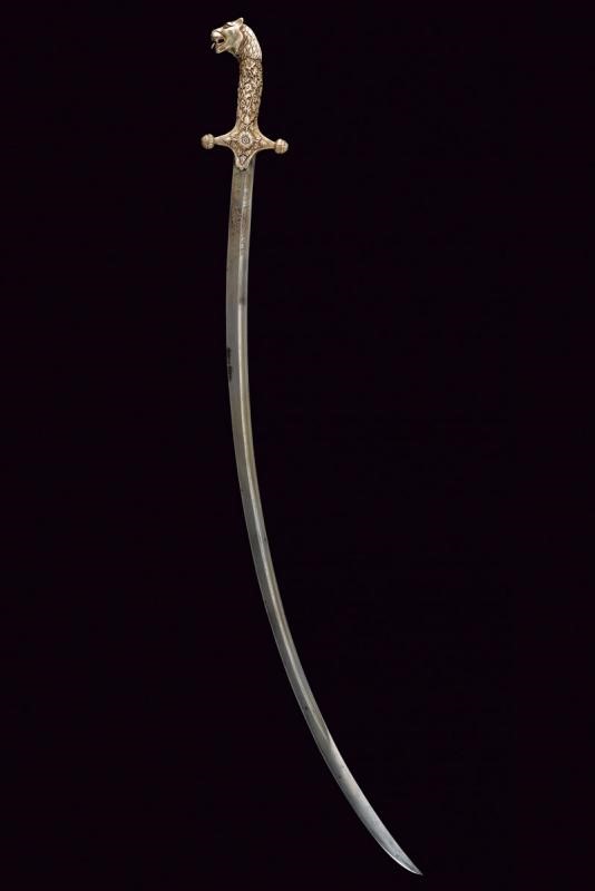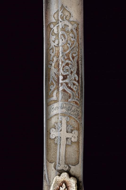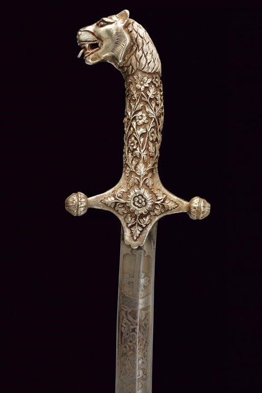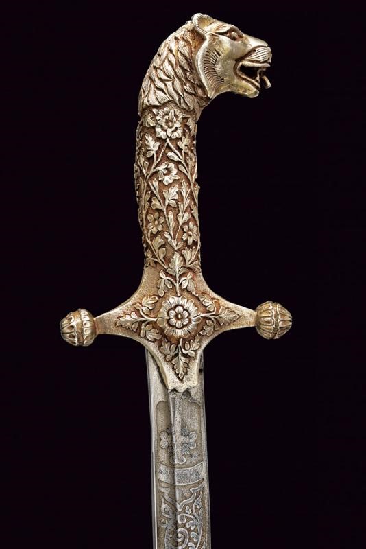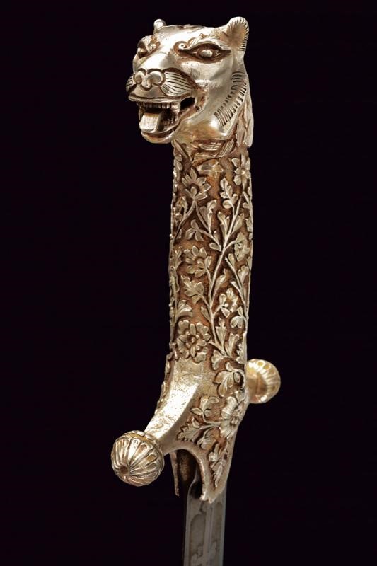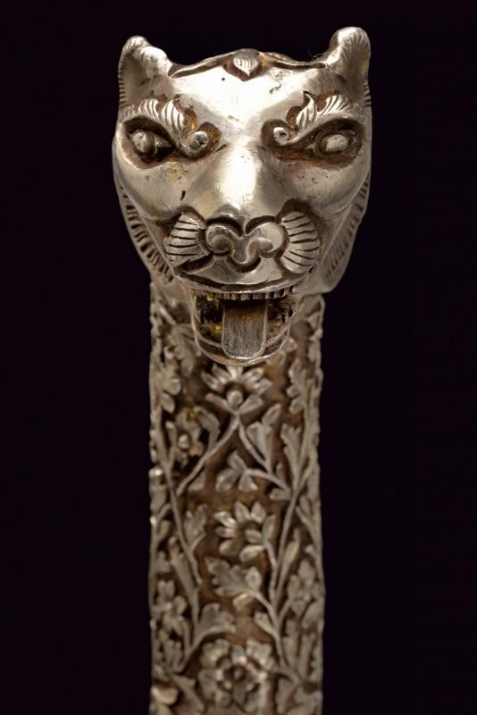 Lama curva a un filo e controfilo con sguscio dorsale, incisa con croce cristiana alla base, arabesche e firmata "Birmingham". Bellissimo fornimento in argento finemente inciso a motivi floreali in bassorilievo, con corte alette fermafodero, bracci dell'elso terminanti a boccioli ed il pomo angolato a grande testa di tigre con fauci aperte.
