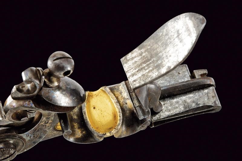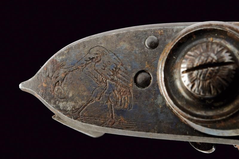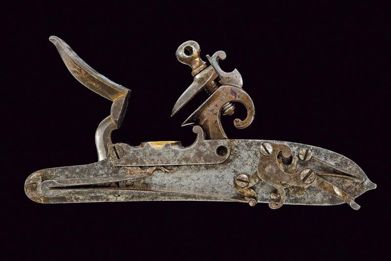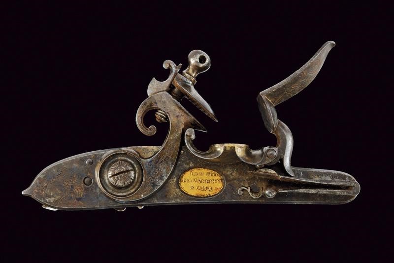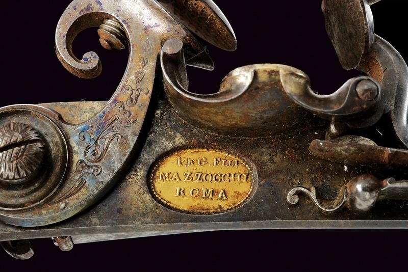 In ferro, cartella di forma piatta con marca rimessa in oro "P.R.C. FLLI MAZZOCCHI ROMA"; alla coda bella incisione di un volatile con un pesce in bocca; bel cane con sobrie incisioni floreali al collo, la ganascia inferiore con ricciolo, la vite incisa con un fiore. Martellina incisa en suite. Scodellino con parte interna foderata d'oro. Rimangono visibili, soprattutto al cane e all coda, resti della brunitura antica. Meccanica ben funzionante.