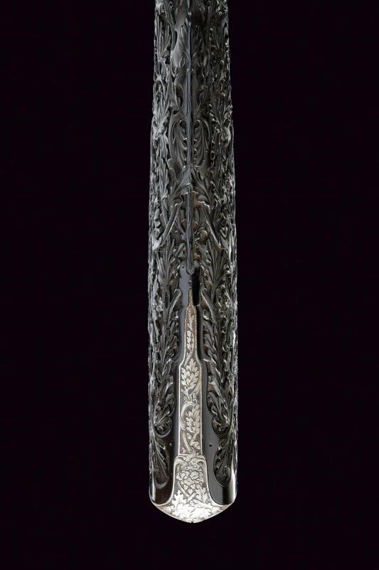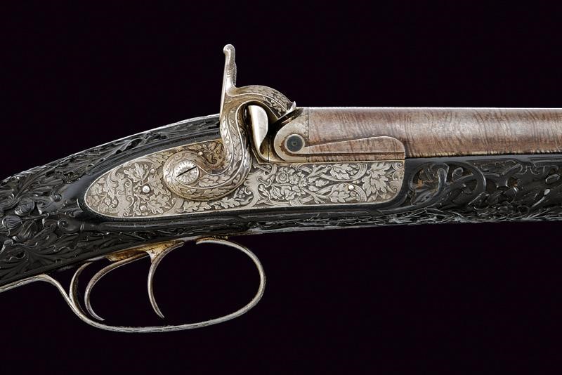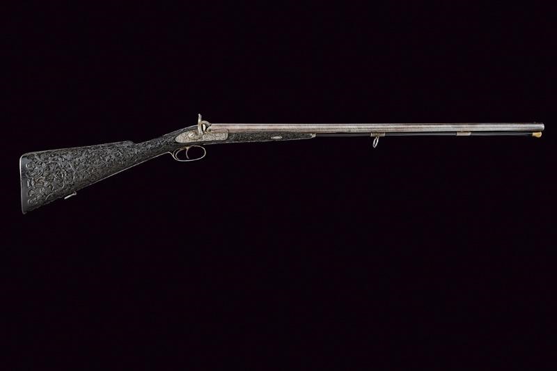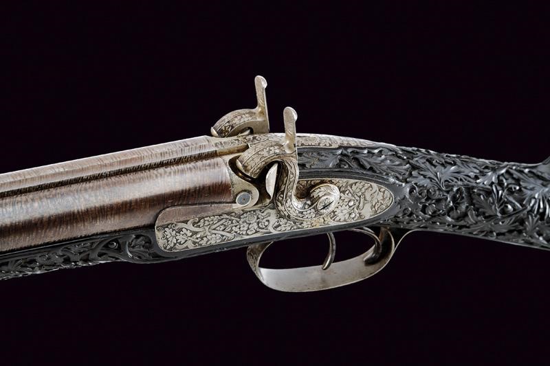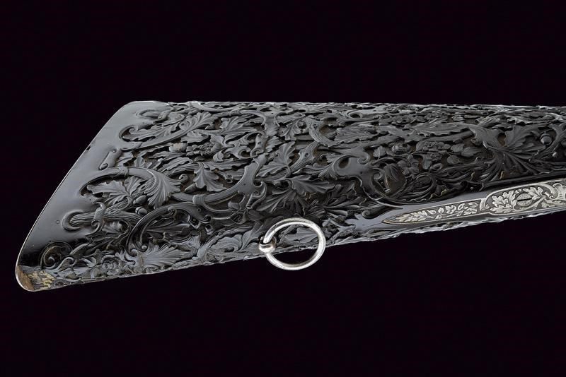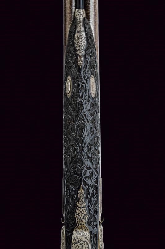 Canne tonde lisce, giustapposte, a torcione, dotate di bindella e con mirino in ottone alla volata; su lato inferiore il punzone del banco di prova di Liegi e il marchio "AF" sotto corona; cal. 17 mm in volata. Batterie a molla in avanti magistralmente incise, come tutti i fornimenti, a motivi fitomorfi. Mezza cassa in ebano splendidamente scolpita a tralci e foglie di quercia; nella parte inferiore vicino al calciolo una piccola e trascurabile mancanza. Fornimenti in ferro. Bacchetta originale in ebano con battipalla e cavastracci in ottone.