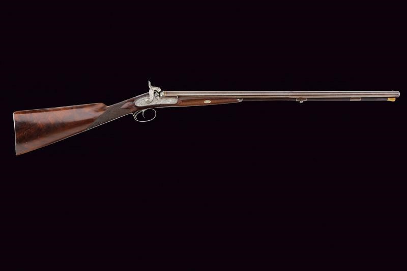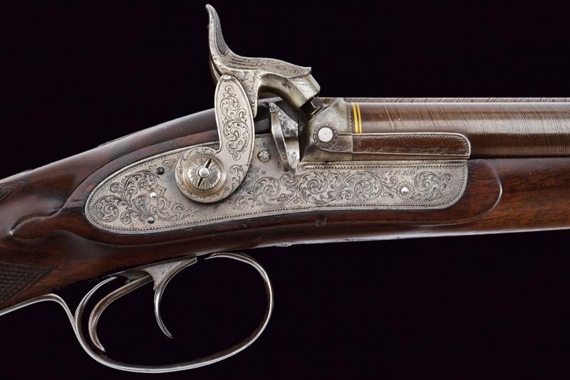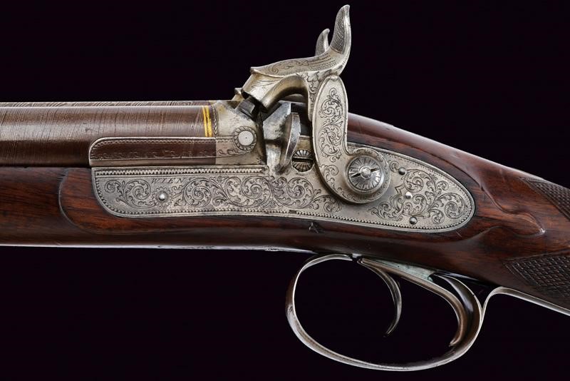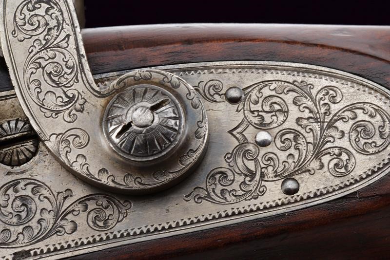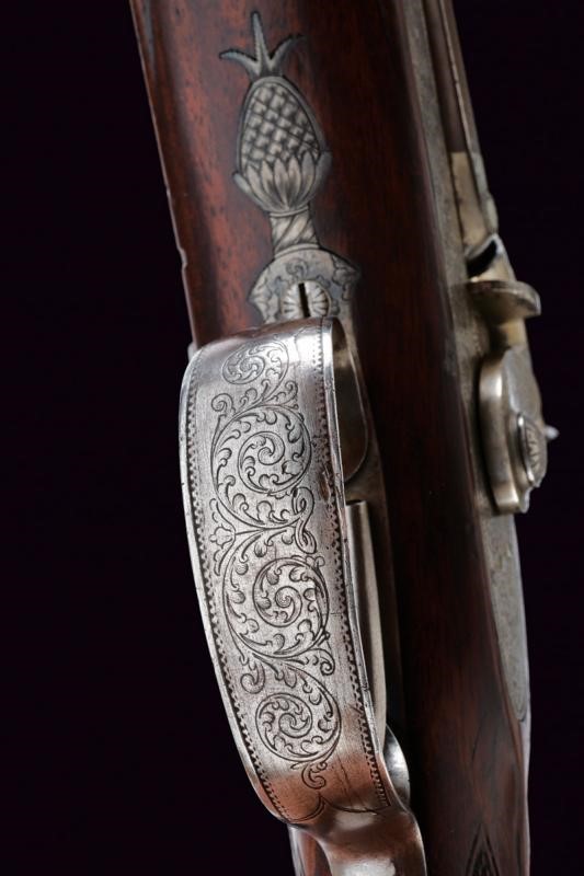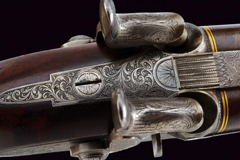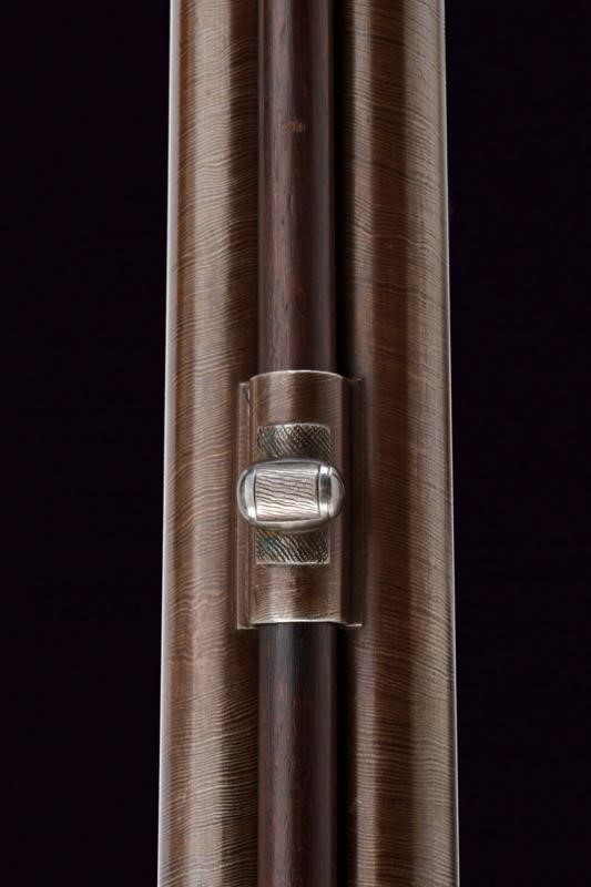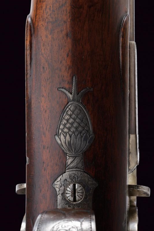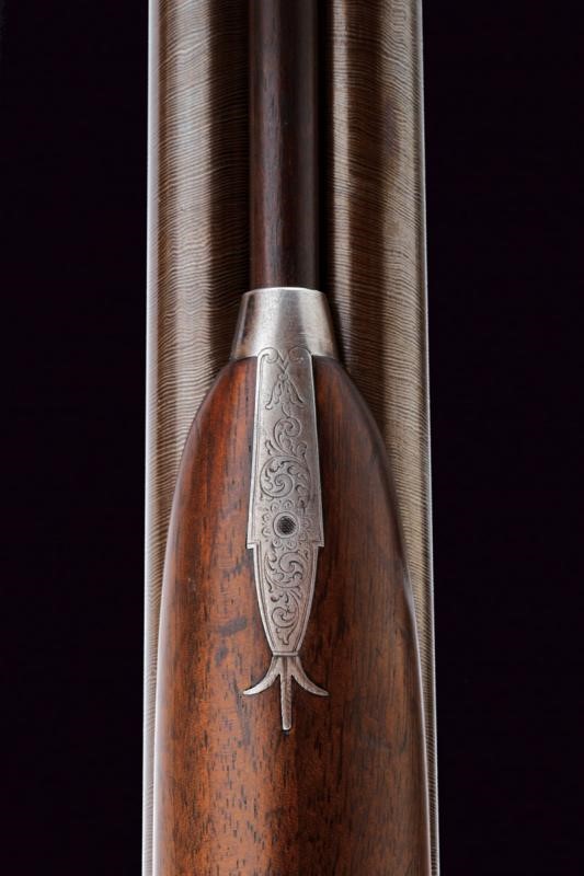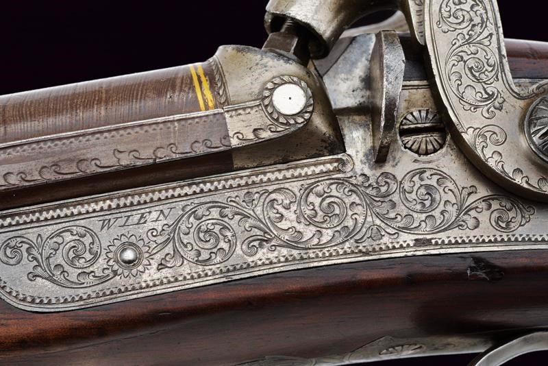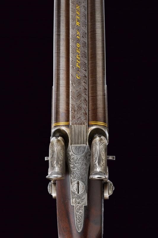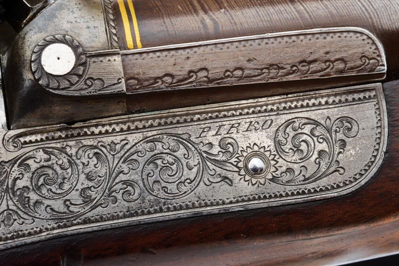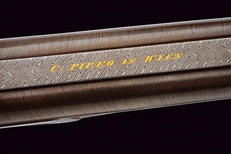 Eleganti canne tonde, giustapposte, lisce, damascate e brunite; la bindella con trama della damascatura differente, firmata alla base in oro "C: PIRKO IN WIEN". Due anelli in oro decorano la culatta; in volata il mirino, cal. 15.5 mm. Codetta incisa a volute e decorata a semicerchio con sole. Batterie a molla in avanti con cartelle firmate "PIRKO / WIEN" e completamente incise a volute, dotate di bordi con cornice a trama zigrinata e munite di parascintille. Mezza cassa in legno con collo microzigrinato. Fornimenti in ferro incisi en suite. Bacchetta in legno con battipalla e cavastracci in ottone. Meccanica funzionante.