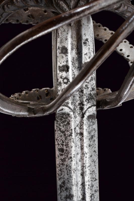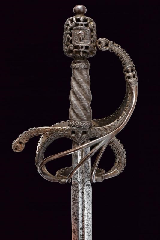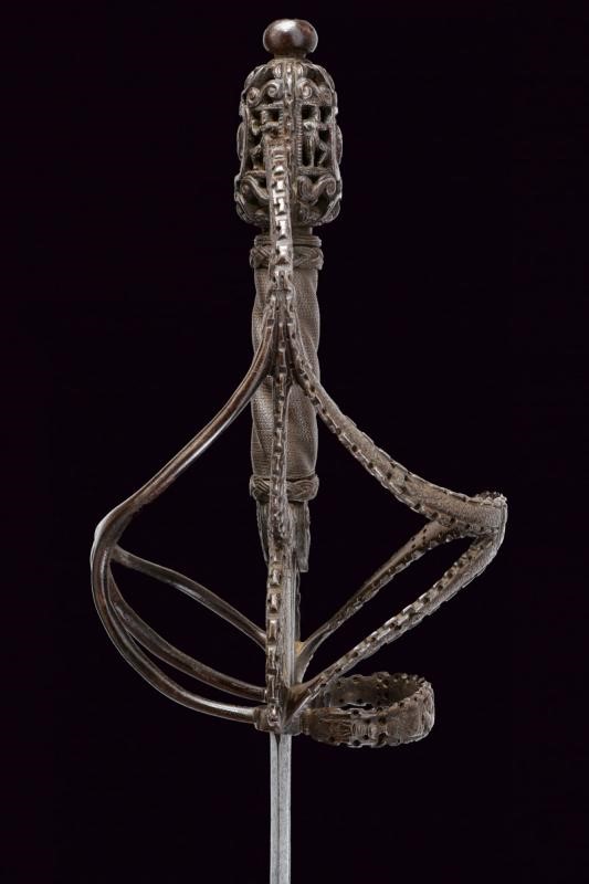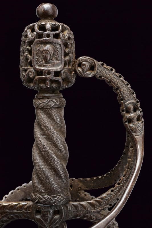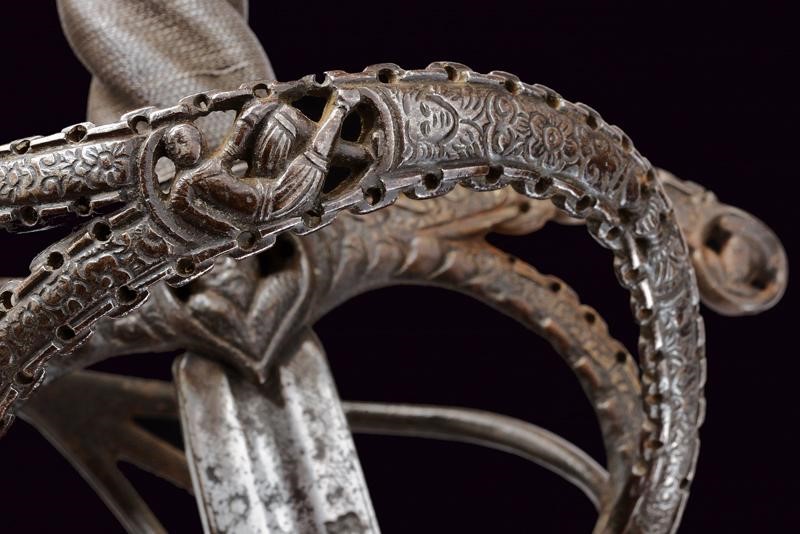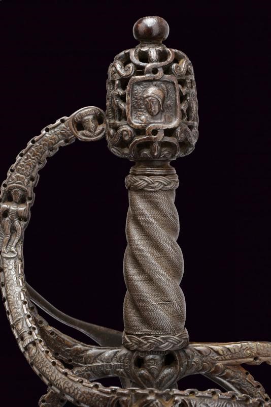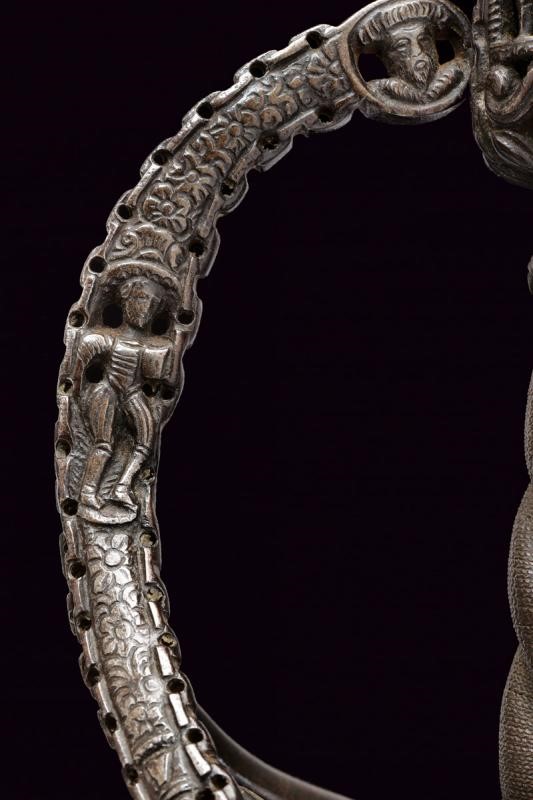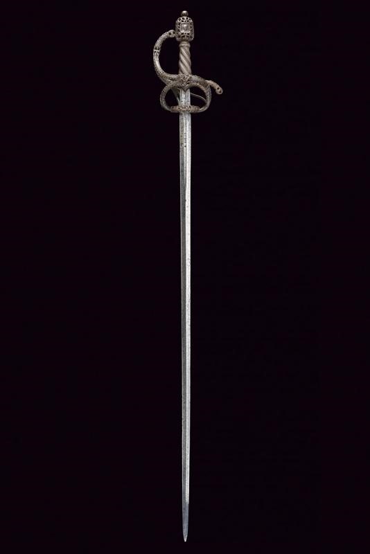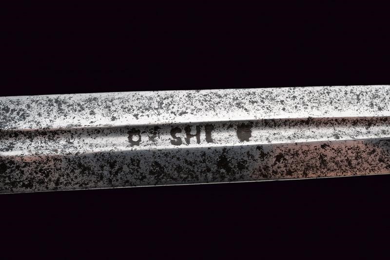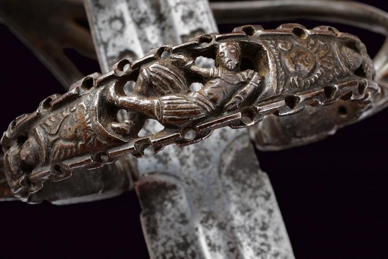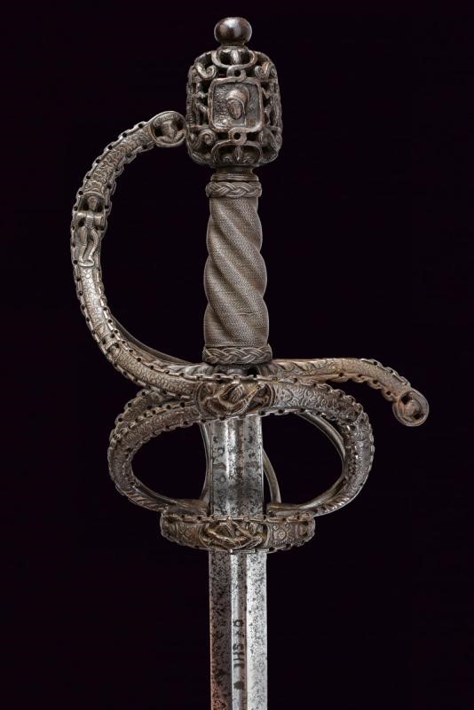 Lama dritta a due fili di sezione esagonale, scanalata in mezzeria al forte, recante breve iscrizione "SHI", altri caratteri poco leggibili, ricasso delineato ai bordi e con resti di punzoni. Bellissimo fornimento in ferro interamente intagliato, traforato ed inciso con personaggi, busti, motivi fitomorfi e catene. Impugnatura in legno con trecciola e teste di moro in filo di ferro.