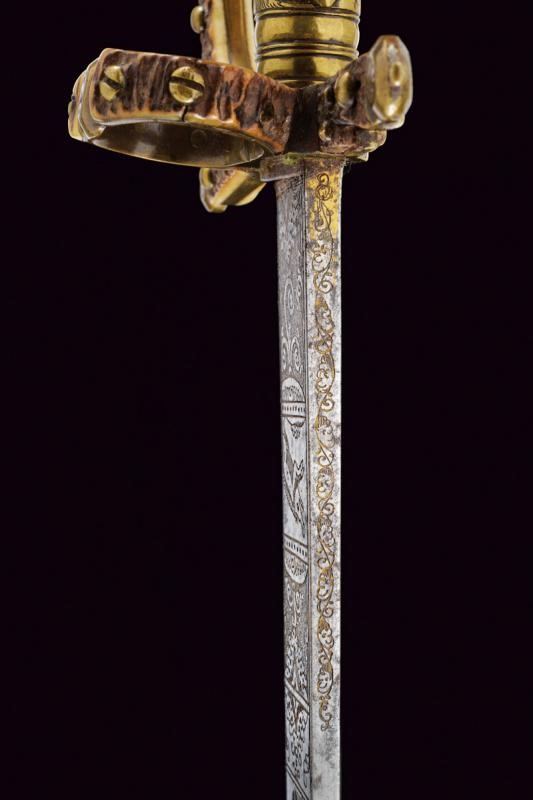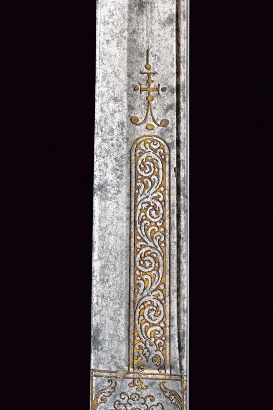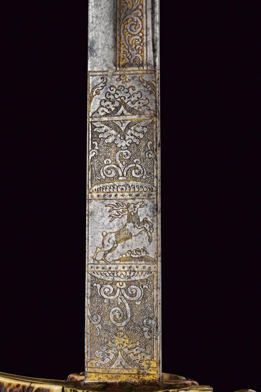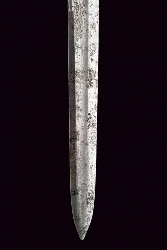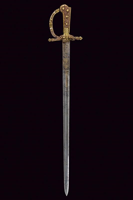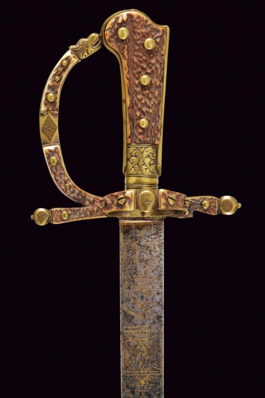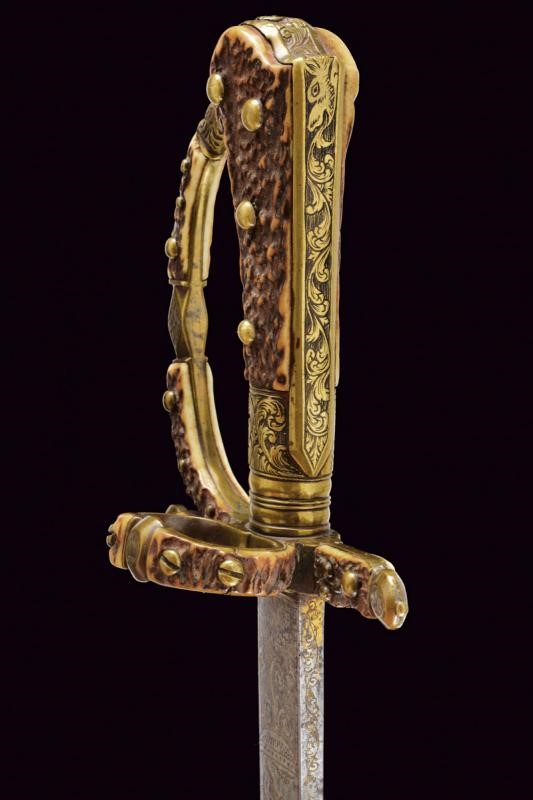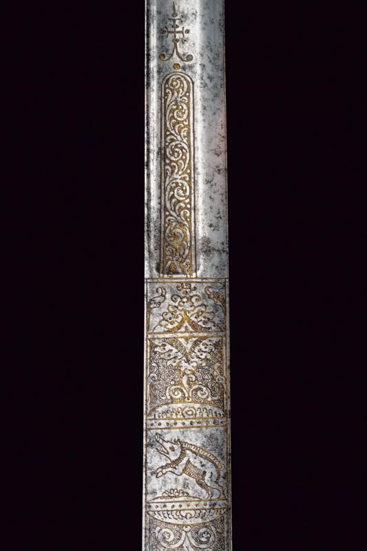 Lunga lama dritta a un filo e controfilo, finemente incisa e con resti di doratura al forte, con effigi di un cinghiale, un cervo e decori floreali; in seguito con sguscio centrale, che percorre quasi tutta la lunghezza, ed una scanalatura dorsale fino al controfilo. Fornimento in ottone, con bracci dell'elso dritti con testa a piccoli dischi, ramo di guardia culminanti con testa di drago. Impugnatura con placche in corno di cervo, questo materiale impreziosisce anche gli altri elementi del fornimento. La cornice centrale dell'impugnatura e la ghiera finemente incise con teste di drago e a motivi floreali.