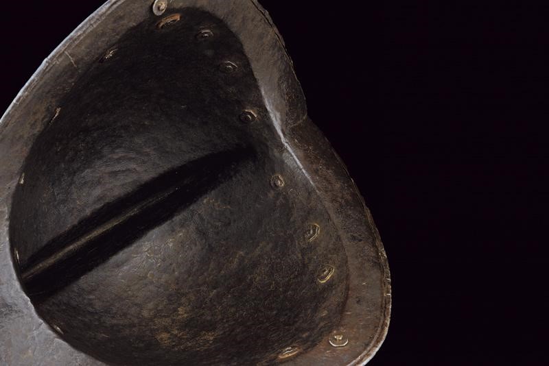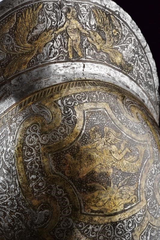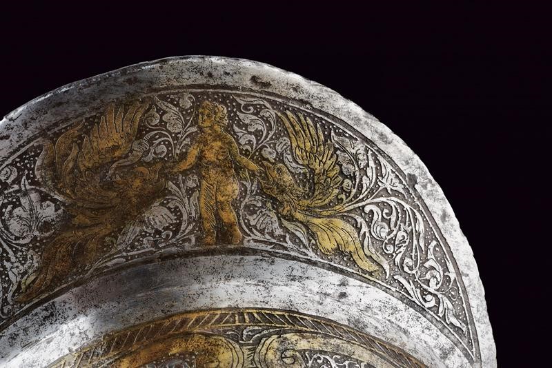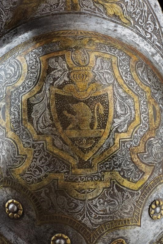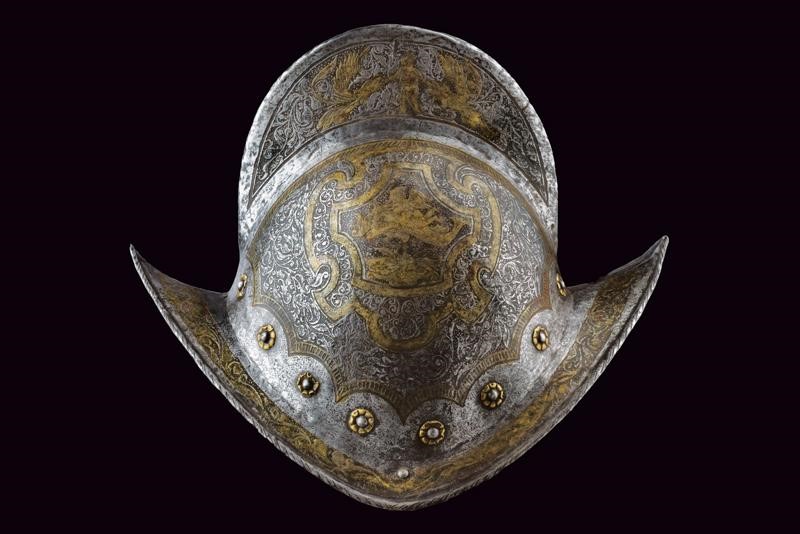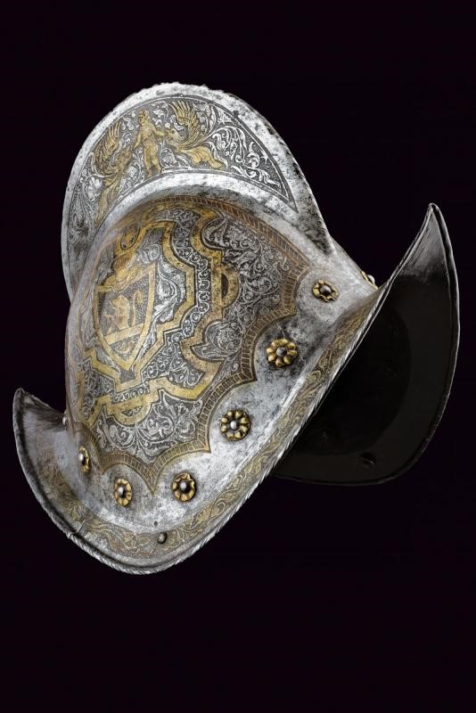 In ferro; con coppo martellato in un solo pezzo con cresta di media altezza a bordo lavorato a fingere il tortiglione, tesa a barchetta con estremità costolate e appuntite, il bordo orlato, leggermente rilevato e lavorato a fingere il tortiglione. Alla base un giro di ribattini con rosetta in ottone. La superficie esterna incisa; sul lato destro uno stemma nobiliare in oro entro un cartiglio recante un leone su fondo granulato, sormontato da un elmo, sul lato opposto un angelo seduto sopra ad un drago. Il resto della superficie decorato a motivi floreali sempre su fondo scuro granulato e con cornici in oro, la cresta con un putto tra figure grottesche con teste d'aquila con ali e disegni floreali, la tesa con decorazioni floreali. Un lato della tesa con piccola crepa, all'interno ben visibili le martellature.