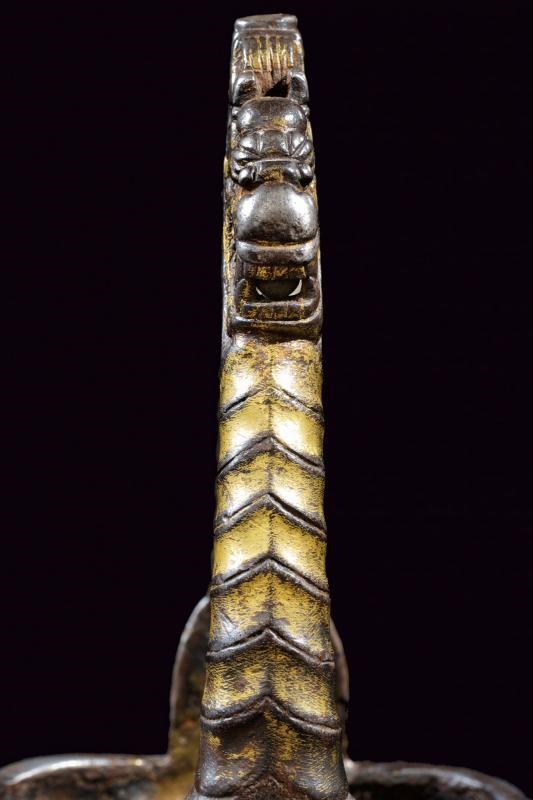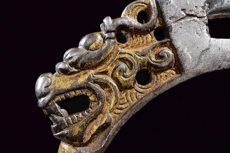 Pesante struttura in ferro, con panche rettangolari munite di foro al centro e spessi bordi rilevati. Interessanti archi con basi lavorate a campana, anch'esse traforate, e collo lavorato a scaglie dorate. Occhi rettangolari affiancati da teste di drago dorate e intagliate quasi a tuttotondo, queste tengono fra le fauci piccole sfere. Mancanze alla doratura.