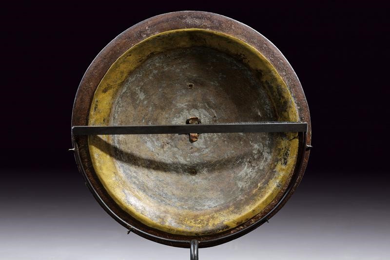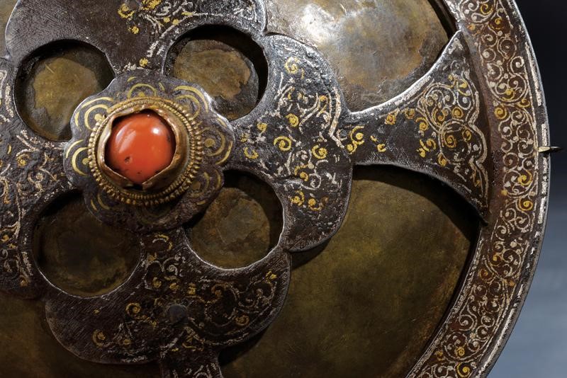 Piatto circolare convesso in lamina di metallo; decorato con una bella cornice in ferro strutturata con quattro rami triangolari convergenti al centro, lavorato a fiore traforato e decorato con una pietra rossa a cabochon, tutta la superficie decorata in oro e argento a motivi floreali (mancanze). Raro.