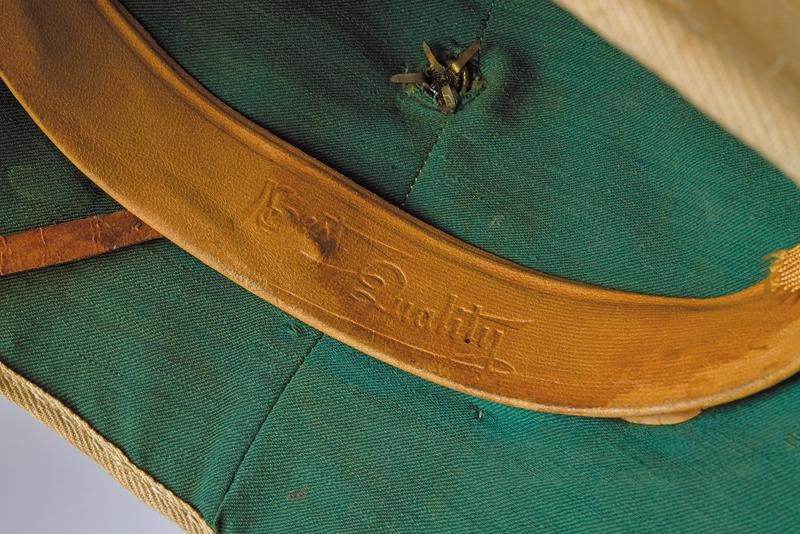 Realizzato in sughero e rivestito in stoffa color sabbia chiaro. Sul frontale coccarda tricolore con fregio del 2° Reggimento del Genio. All'interno alluda in cuoio con marcatura "Best Quality" e soggolo in cuoio. Manifattura inglese?