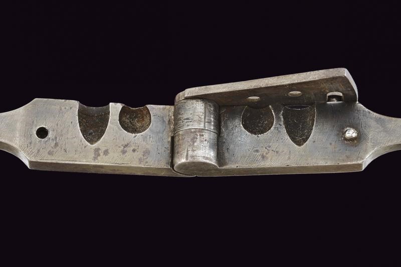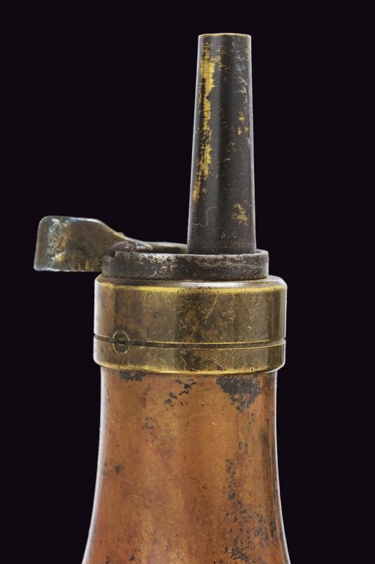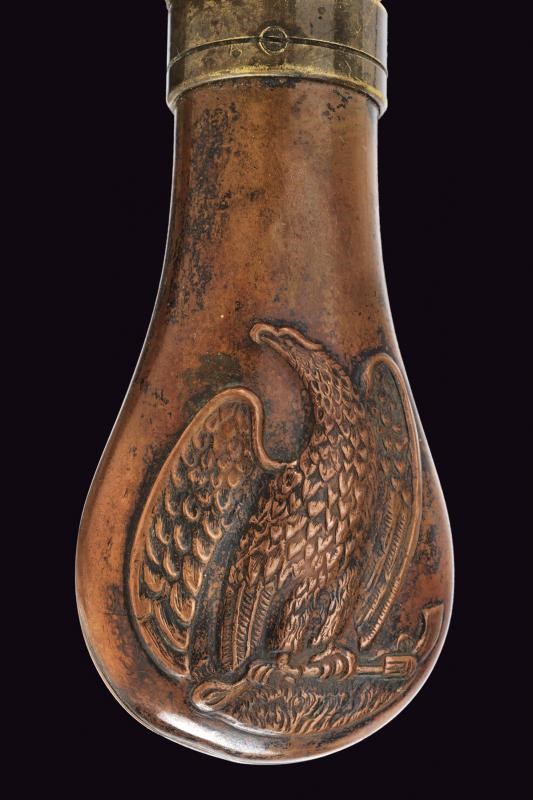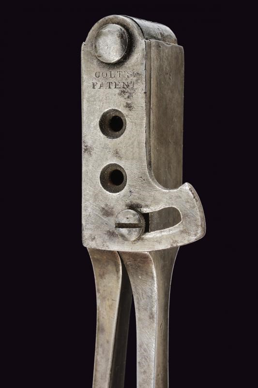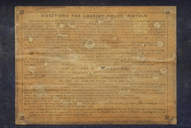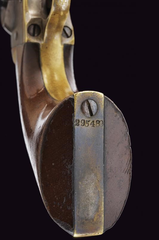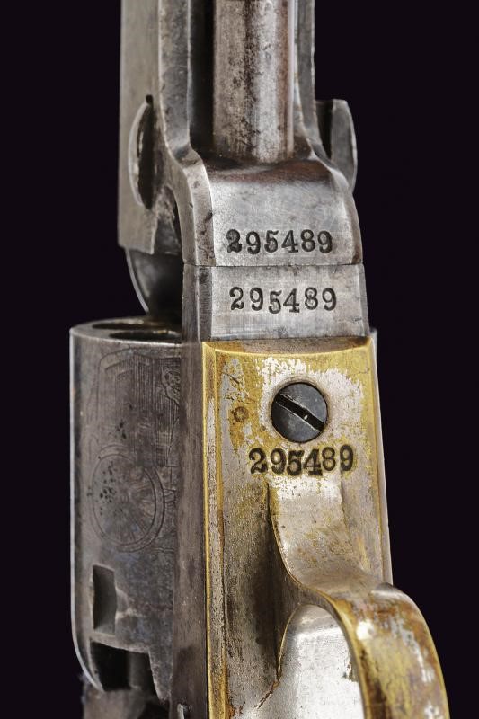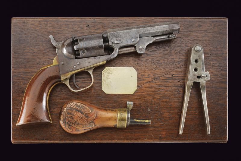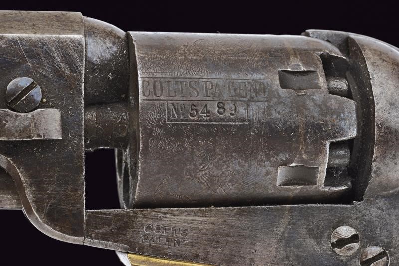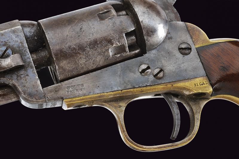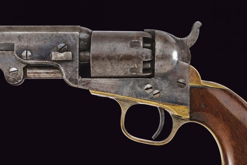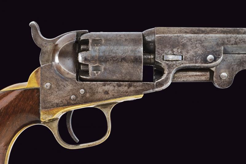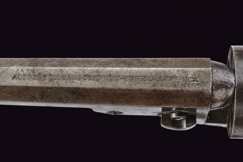 Canna corta da 4" ottagonale, con mirino tondeggiante in ottone, marcatura in una riga "ADDRESS COL SAM.L COLT NEW-YORK US AMERICA" tra parentesi graffe, Cal. 31. Anima con rigatura visibile ma molto incrostata. Tamburo a sei colpi con scena di attacco alla diligenza ancora discretamente visibile, marcatura "COLTS PATENT". Castello con marcatura "COLTS PATENT". Matricola "295xxx" coeva su canna, castello, ponticello, impugnatura e tamburo (abbreviata). Bande in ottone con resti di argentatura. Impugnatura in noce. Meccanica ben funzionante. Esternamente molto "fresca" e ben conservata, con solo lievi intaccature e tracce della finitura originale. In una vecchia cassetta in legno con con fodera interna in tessuto blu recante segni d'uso e del tempo. All'interno del coperchio istruzioni d'utilizzo di pistole Colt. Nella dotazione un fondipalle Colt marcato, una fiaschetta del tipo in uso all'epoca, una scatoletta per capsule marcata "ELEY LONDON". Completa di chiave.