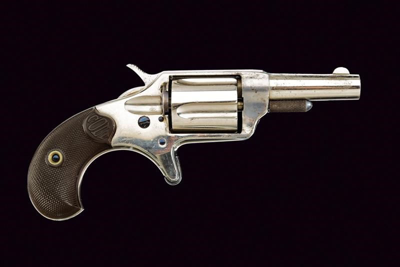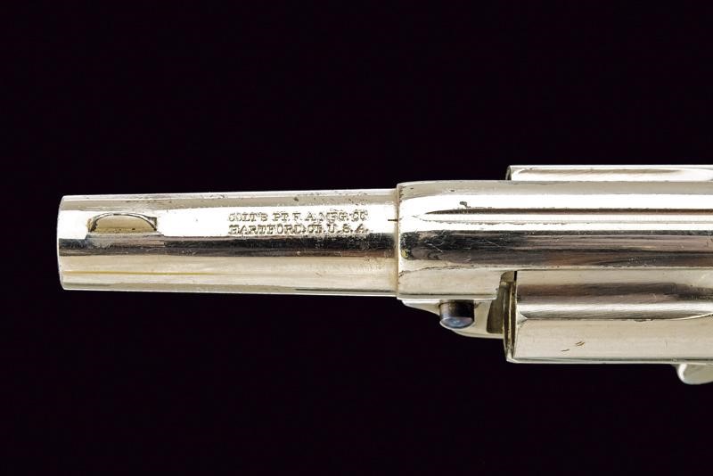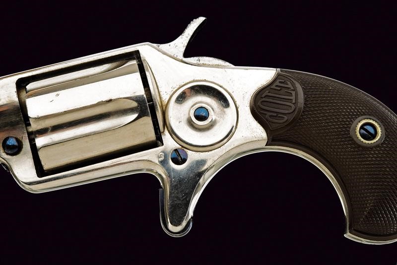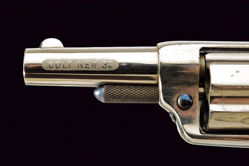 Canna tonda rigata (anima pulita, rigatura ben visibile) recante marcatura della ditta e sul lato marcatura del modello. Cal. 32 centerfire. Tamburo a cinque colpi. Guancette in gommadura zigrinata con marchio "COLT". Meccanica funzionante. Nichelatura con qualche intaccatura. Grilletto a sprone, viti, pulsante e cane bruniti.