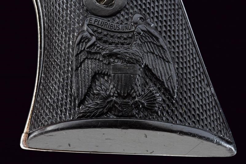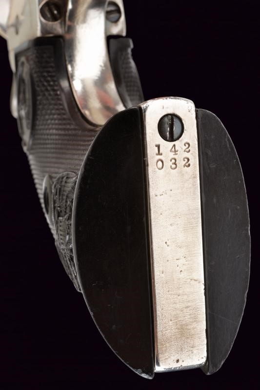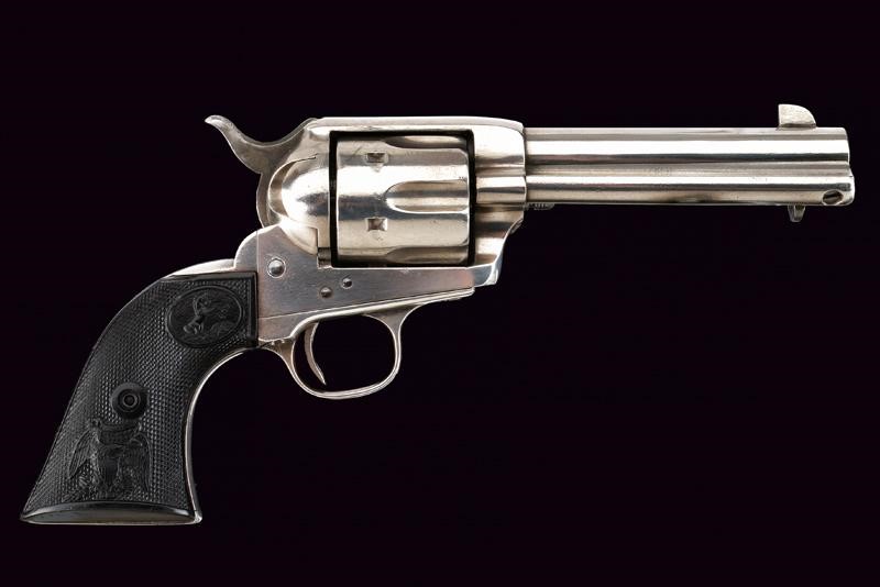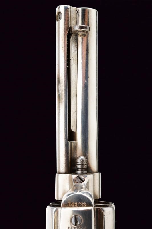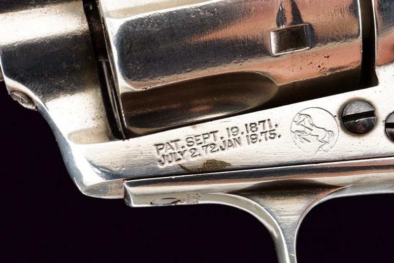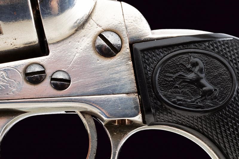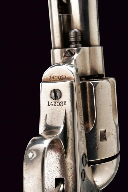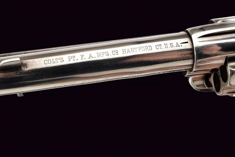Canna tonda da 4-1/3" (12 cm.) con marcatura dorsale "COLT PT. F. MFG. C HARTFORD CT U.S.A.", sul fianco invece la dicitura "COLT FRONTIER SIX SHOOTER" (cal. 44 40). Mirino. Anima pulita con un po' di pitting e segni d'uso all'interno, la rigatura visibile. Tre scatti in tutto, il primo senza sicura. Castello con emblema del cavallino rampante e brevetti del 1871 e del 1875. Impugnatura con guancette in gommadura zigrinata color nero ed emblema in rilievo, una con marcatura della Colt all'interno. Matricole "142xxx" coeve su castello, ponticello e impugnatura. Nichelatura leggermente rinfrescata. Meccanica funzionante.
