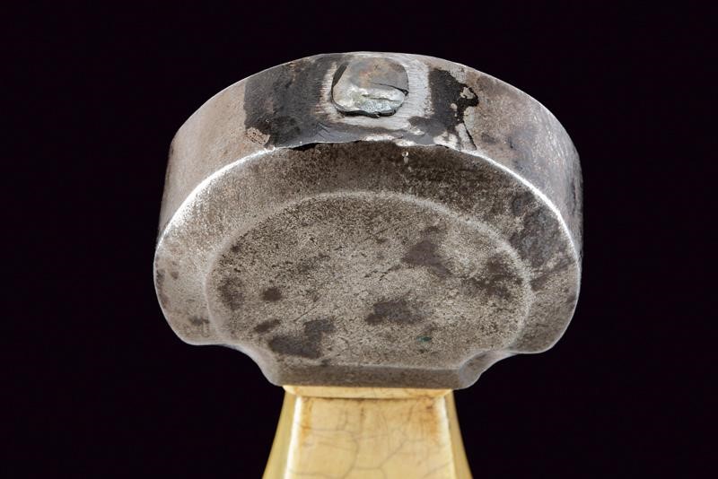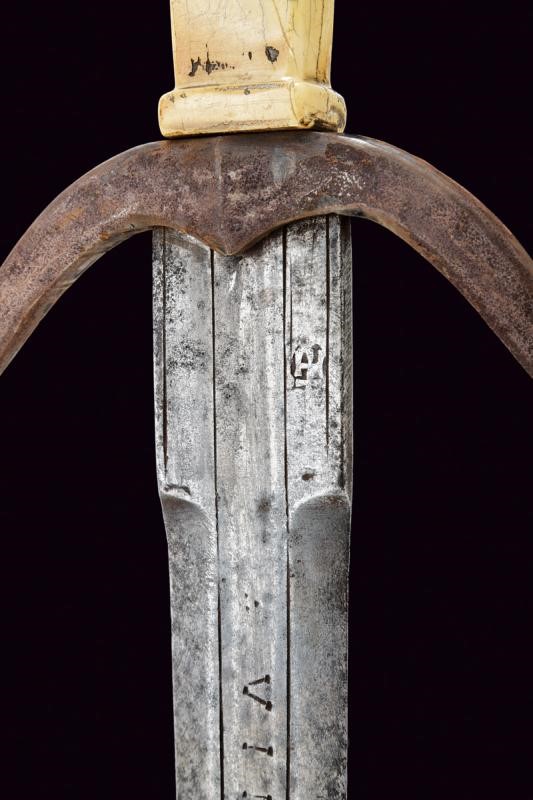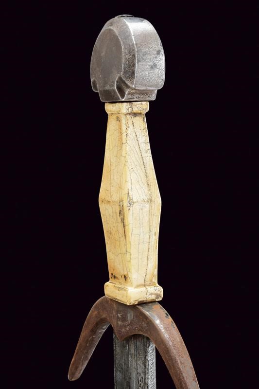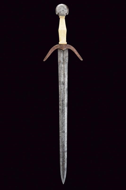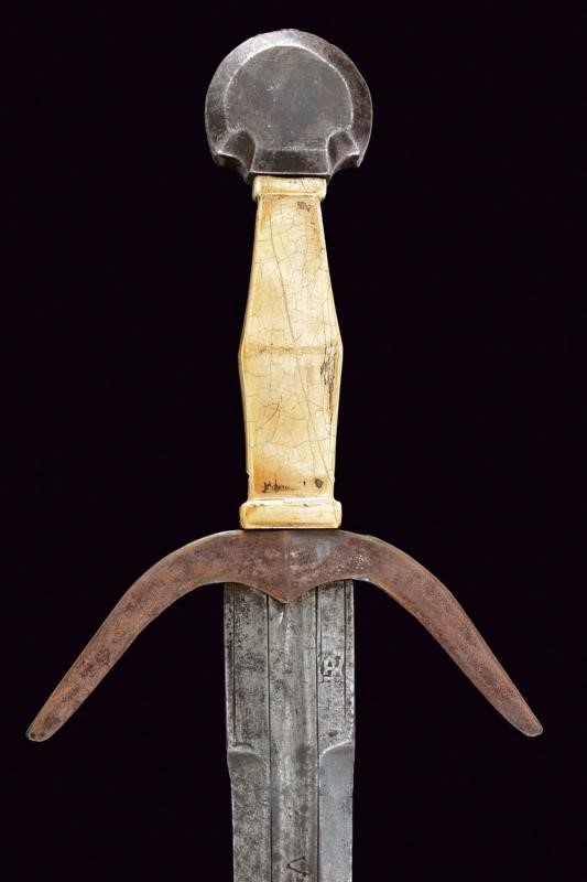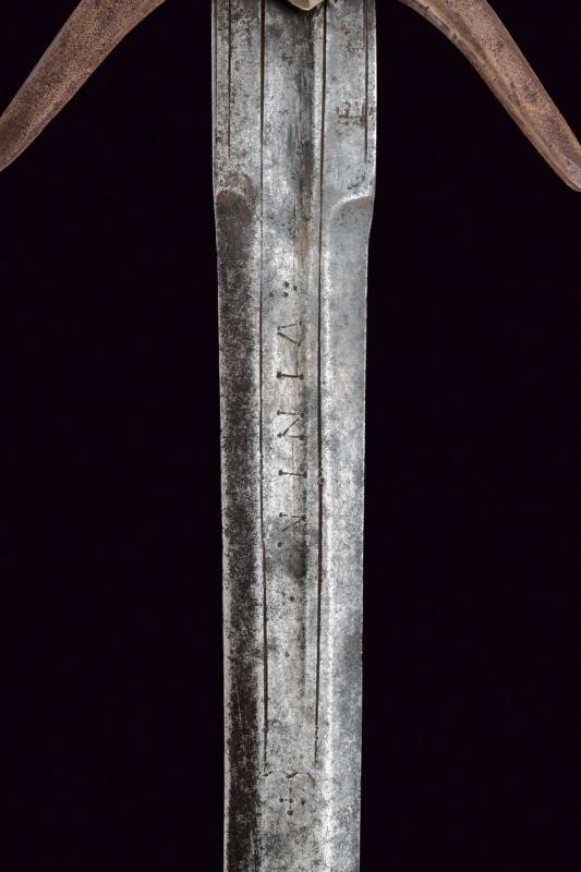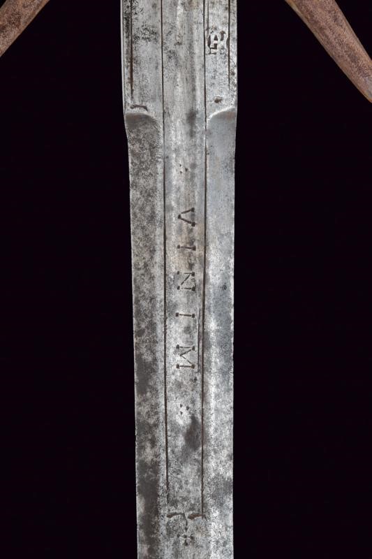 Lama antica accorciata (XVI secolo) dritta a due fili, di sezione esagonale; dallo spesso tallone, munito di una bella marca, parte una leggera sgusciatura che prosegue per circa 12 cm, in questo segmento vi è l'iscrizione "VINIM" su entrambi i lati; elso in ferro (fine XIX secolo). Pomo sferico faccettato con base rettangolare (storicismo ?). Impugnatura in materiale composto (difetti e mancanze), anch'essa del periodo dello storicismo. Interessante lama.