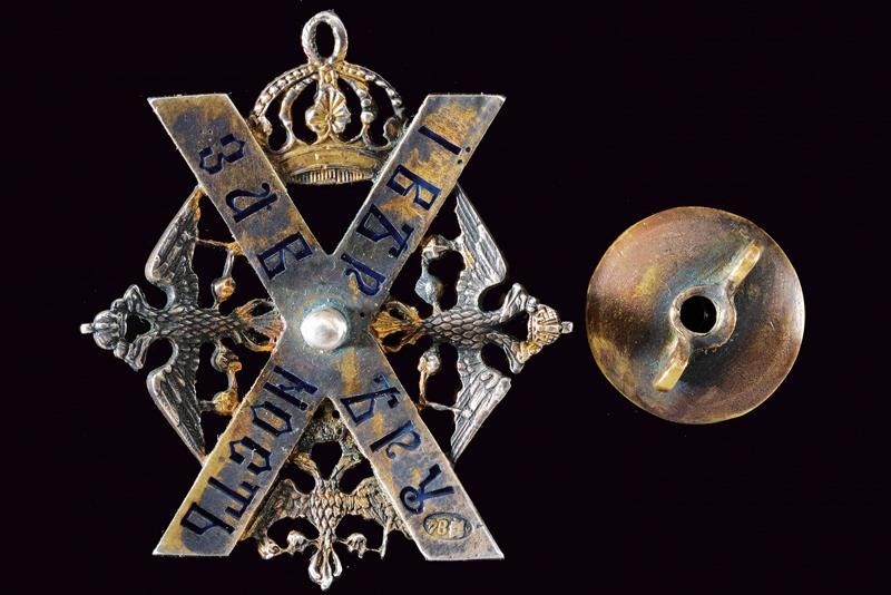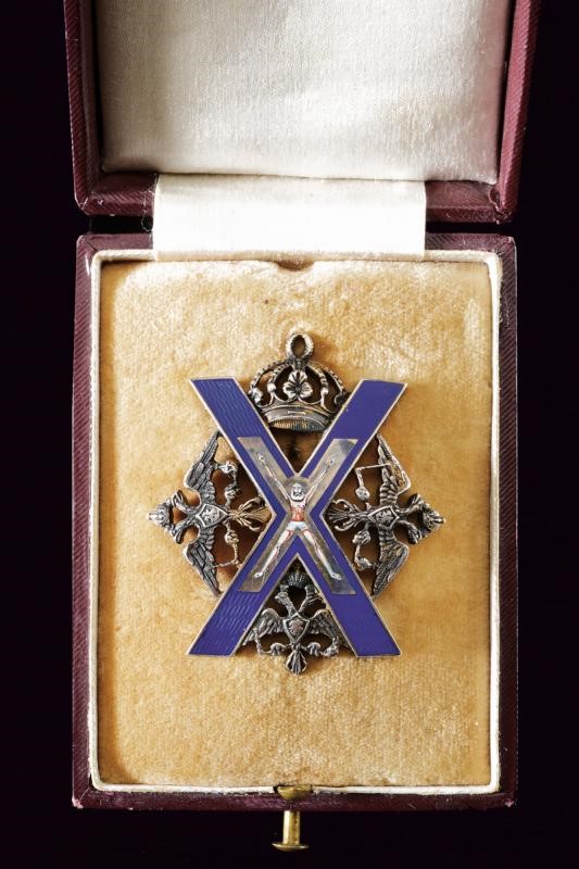 In argento con croce di Sant'Andrea smaltata, nei quattro settori individuati dalla croce sono presenti tre aquile bicipiti e in quello superiore, una corona. La parte posteriore con iscrizione in cirillico "Per la fede e la lealtà" e con punzone "84". In astuccio (pertinente?).