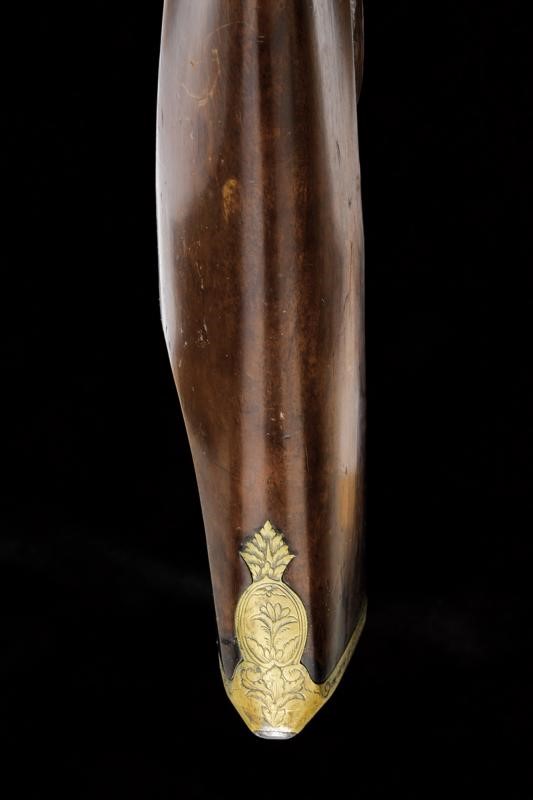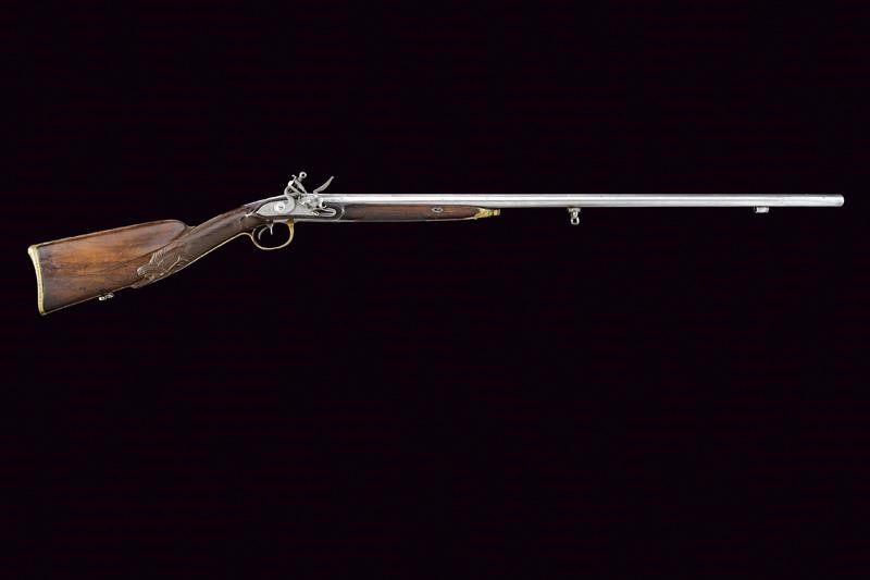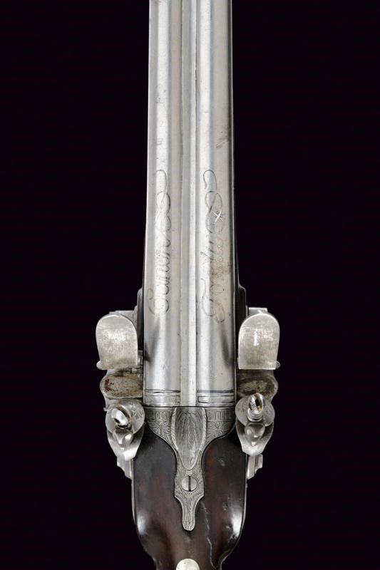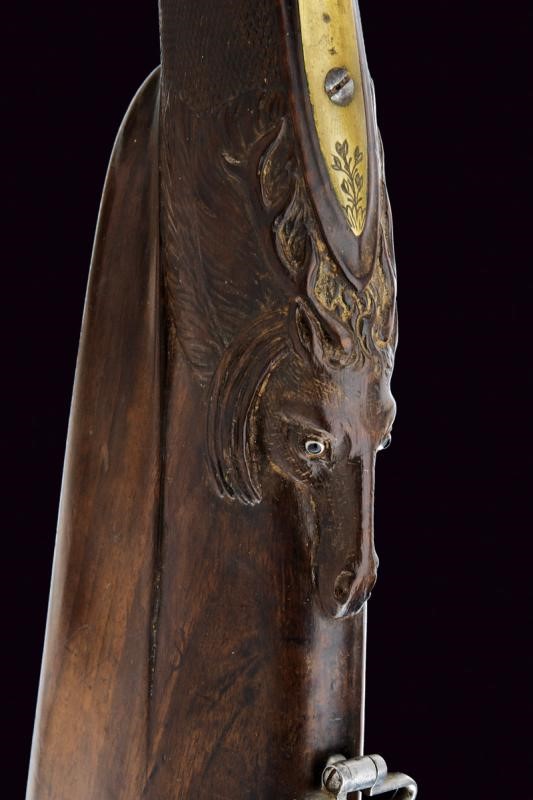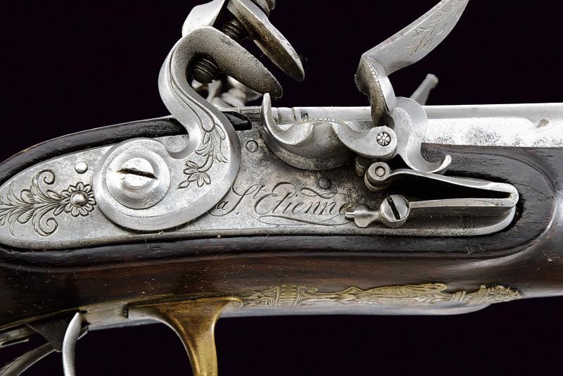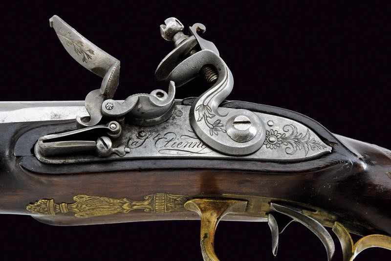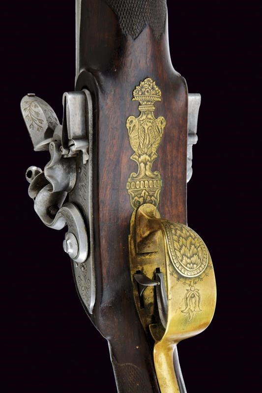 Canne tonde, lisce, piatte ai lati, con cornici alla base, foconi argentati, con iscrizione "Canon Fondue" rimessa in argento (mancanze alla finitura). Codetta finemente incisa e dotata di traguardo. Batterie a pietra focaia firmate "St. Etienne", incise a motivi floreali e munite di sistema antifrizione e a tenuta stagna. Meccanica funzionante. Mezza cassa in legno con astina e collo zigrinati, la parte inferiore del collo scolpita a testa di cervo con occhi in vetro. Fornimenti in ottone finemente inciso a motivi floreali, la parte anteriore del ponticello anche con due cigni. Perno fermacanne e bacchetta mancanti.