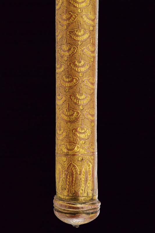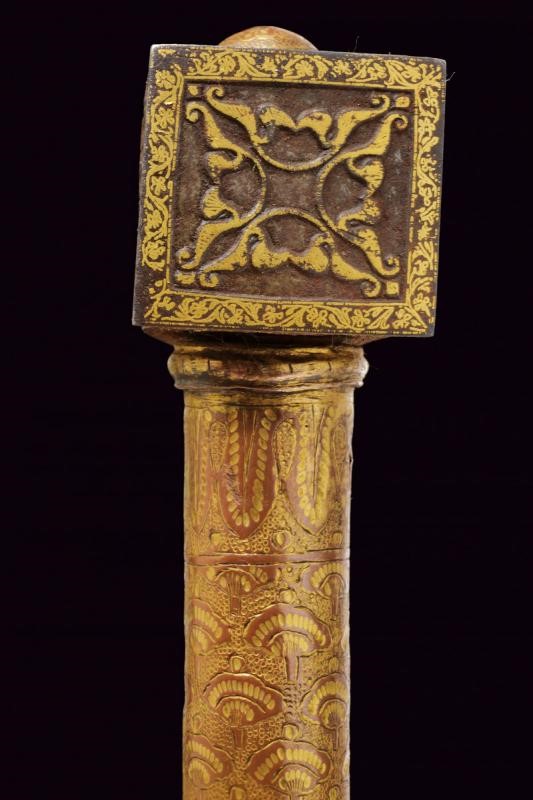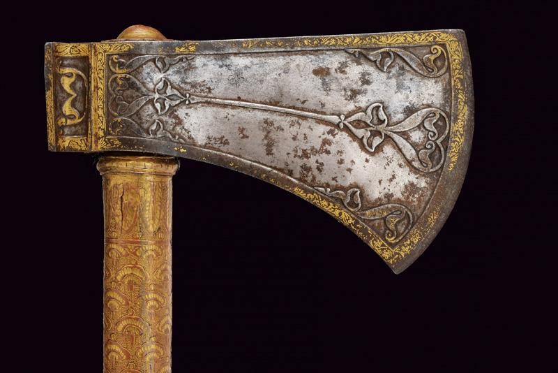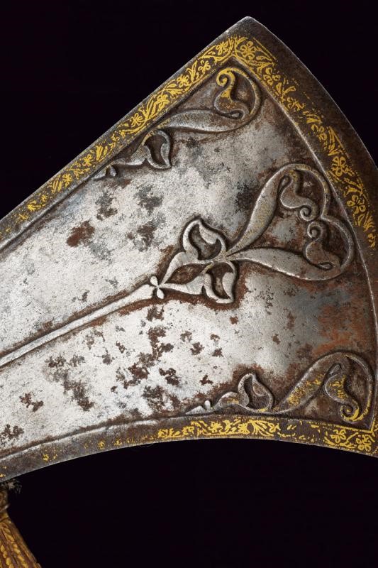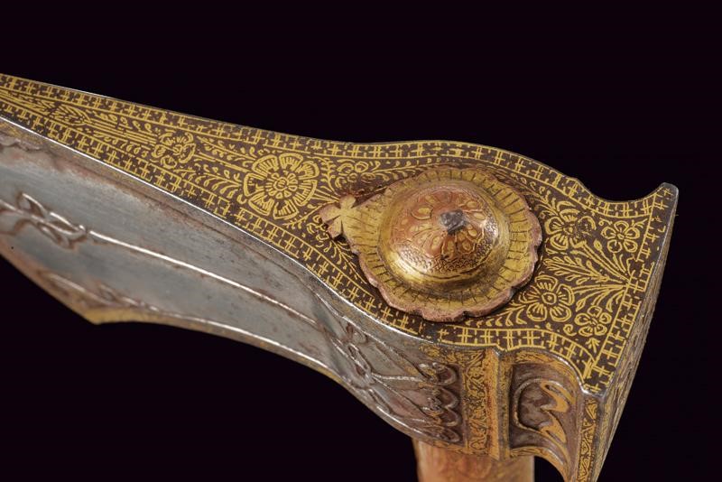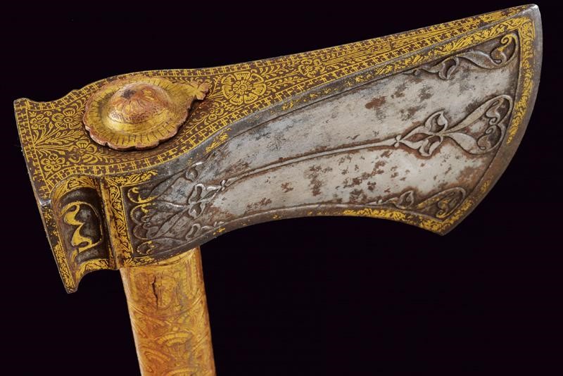 Testa in ferro con scure di taglio convesso avente superfici laterali con intagli in bassorilievo a motivi floreali; i bordi, il dorso superiore e il lato inferiore impreziositi con bellissime decorazioni in oro a motivi geometrici e floreali; martello lavorato en suite sia nell'intaglio del ferro che nelle decorazioni in oro. Fusto cilindrico in legno completamente rivestito da lamine di tombacco, divise in tre segmenti, incise e dorate a motivi geometrici e floreali; la base culminate in un'emisfera schiacciata.