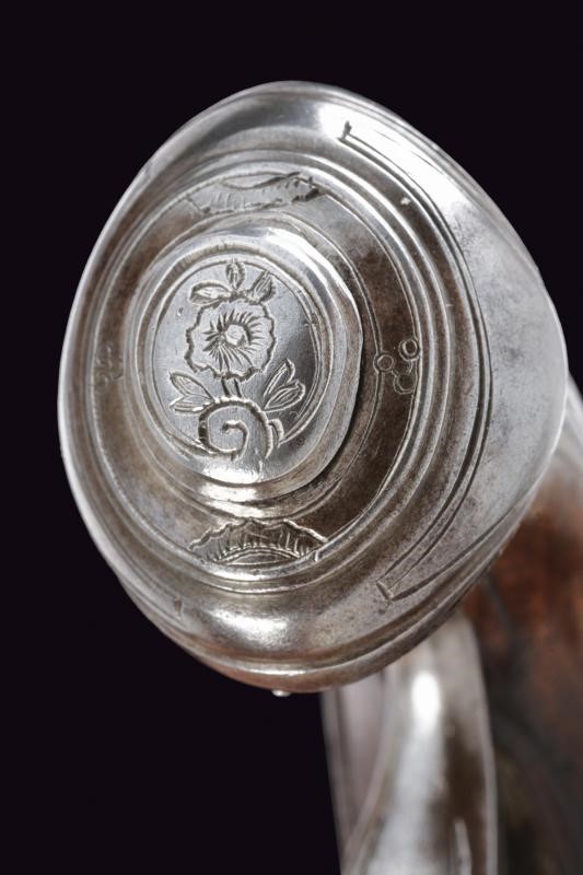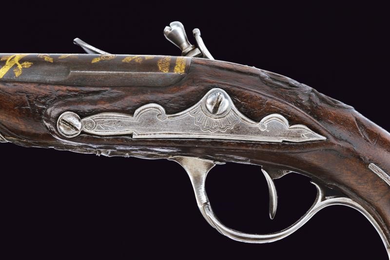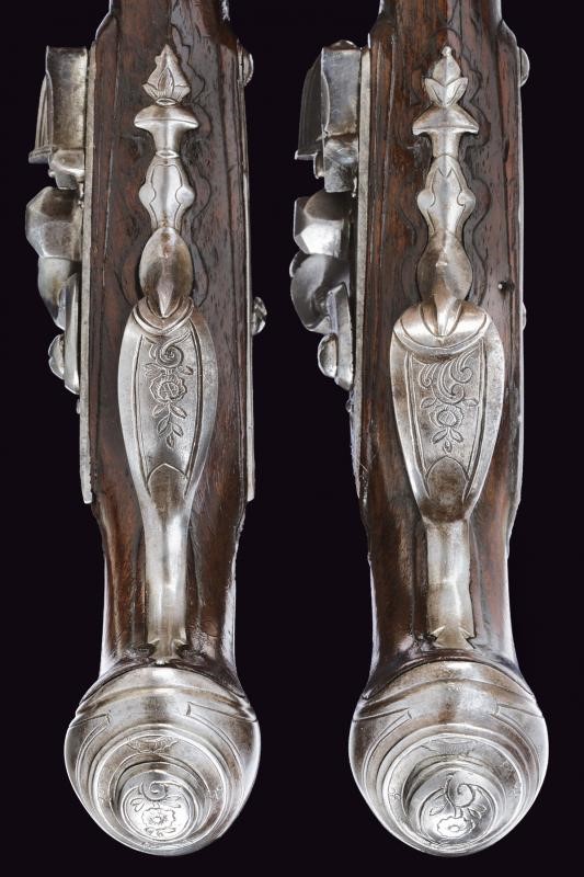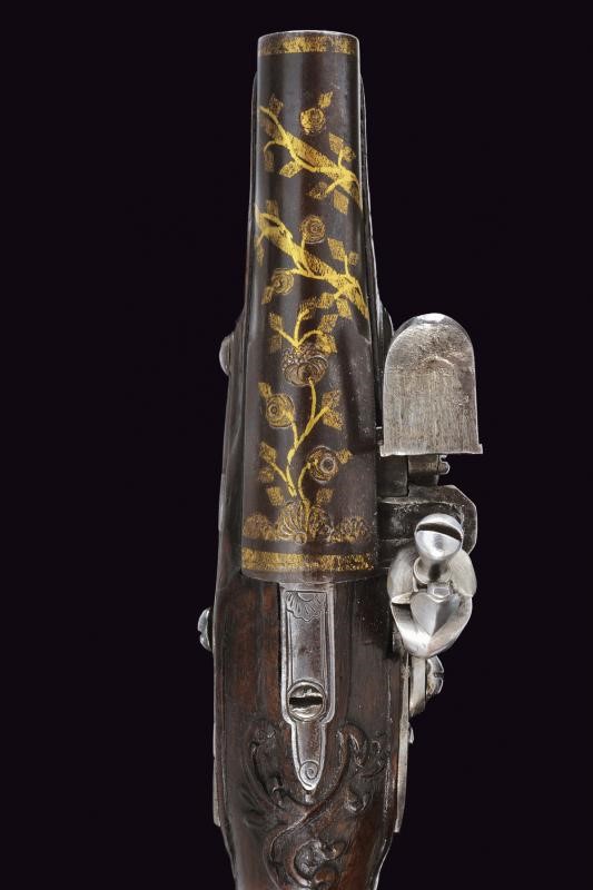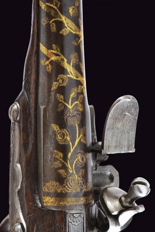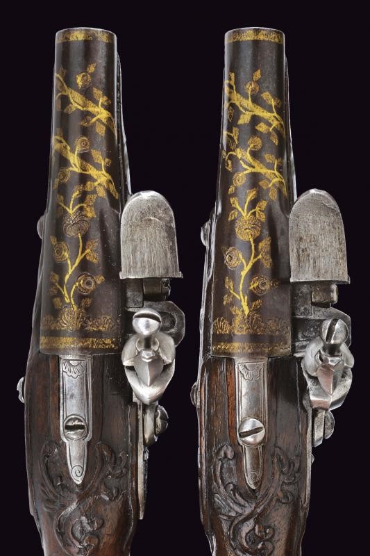 Canne lisce tonde, con fianchi appiattiti nella prima metà, con belle agemine in oro e incisioni effigianti rampicanti e rose, culatta e volata con cornici dorate. La superficie con resti dell'antica brunitura. Cal. 11,2 mm. I codoli color acciaio, scorniciati e incisi con rocaille. Batterie a cartella piana con delineature e rocaille incisi alla codetta, simili fregi sul collo dei cani (le meccaniche entrambe funzionanti, una con corsa del cane un po' corta). Casse intere in noce con scorniciature attorno ai fornimenti e dorsi intagliati a fiorami. Fornimenti in ferro delineati e parzialmente incisi. Bacchette in legno con battipalla in corno chiaro.