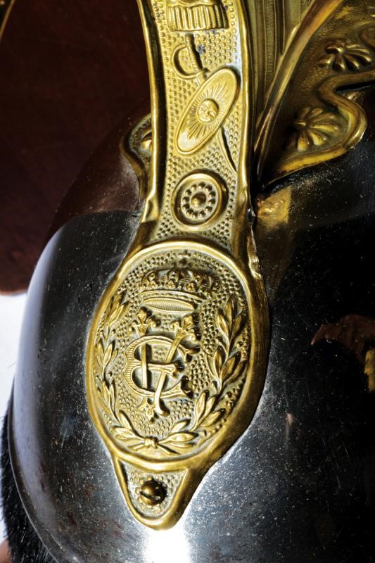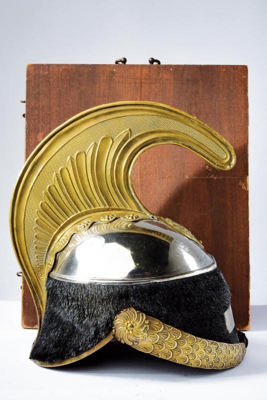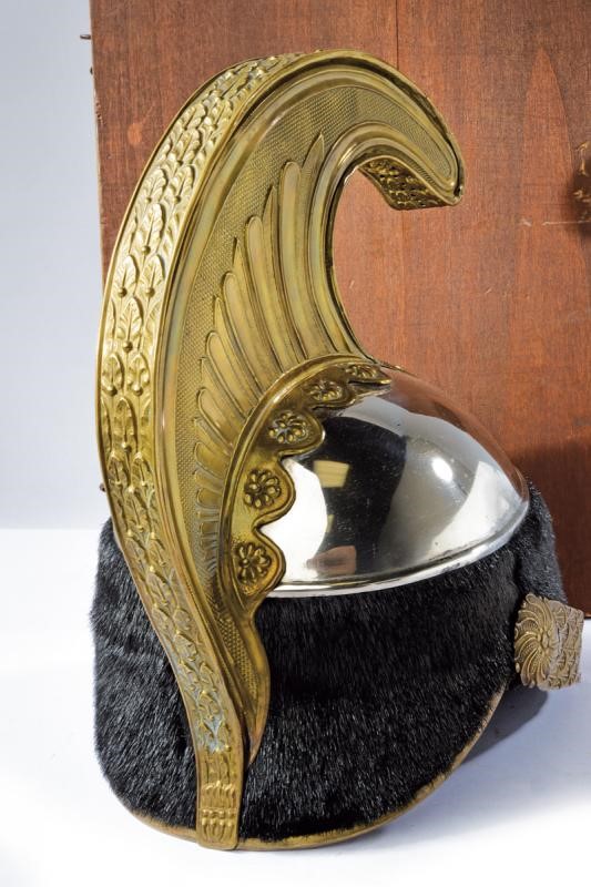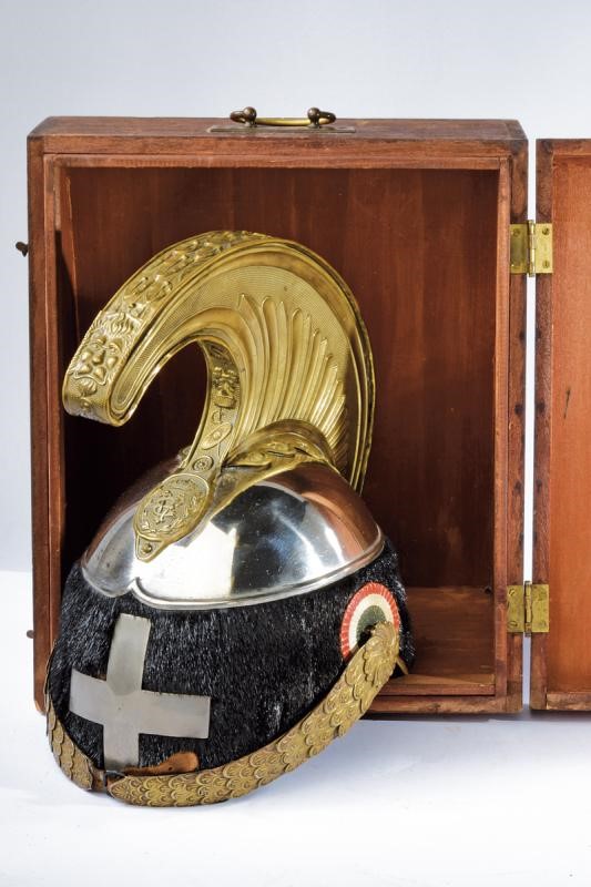 Coppo in ferro (lievissime mancanze alla finitura) con turbante in pelliccia (phoca vitulina) ben conservato, fregio piatto a croce sabauda. Cimiero con cresta in ottone dorato e finemente cesellato, recante testa di leone sbalzata e, alla base, oliva con il monogramma "VE" coronato. Soggoli corazzati con placche in ottone dorato, la parte interna in velluto. Coccarda tricolore in cuoio sul lato sinistro. All'interno cuffia in pelle in con segni d'uso e del tempo. In custodia lignea di trasporto, ben conservata.