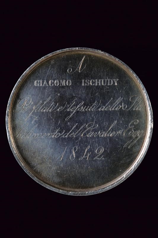 Medaglia premio in argento. Al dritto iscrzione al bordo "FERDINANDVS II REGNI VTRIVSQVE SICILIAE ET HIERVS REX", al centro busto del re verso destra; opus "A. CARRIELLO FEC / R.CICCARELLI". Al rovescio "A GIACOMO ISCHUDY / Per filati e tessuti dello Stabilimento del cavalier Egg. / 1842". 79 g. Rara.