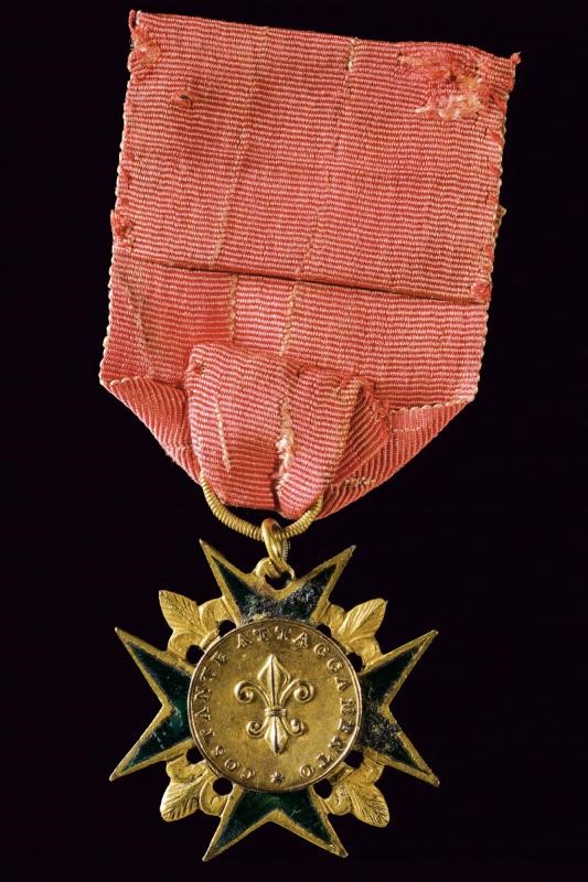 Medaglia militare per costante attaccamento, in bronzo dorato e smalti (danni e mancanze). Al dritto FERDINANDO IV. ISTITUì, testa del Re con corona a destra. In basso: 1816. Al rovescio: Giglio Borbonico, attorno COSTANTE ATTACCAMENTO. In basso: stella. Con nastro antico. Rara.