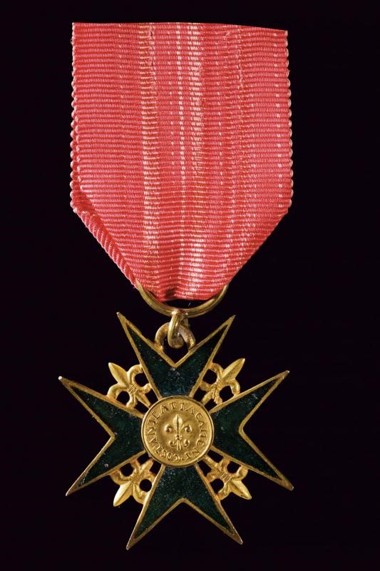 Medaglia civile per costante attaccamento, in bronzo dorato e smalti (mancanze e restauri). Al dritto FERDINANDO IV. ISTITUI, testa del Re con corona a destra. In basso: 1816. Al rovescio: Giglio Borbonico, attorno COSTANTE ATTACAMENTO. Con nastro rosso. Rara.