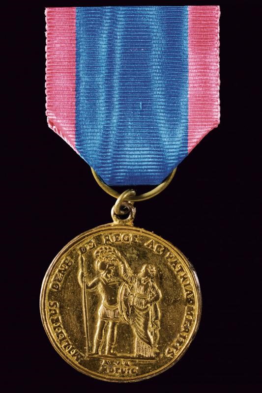 Medaglia al valor militare, in bronzo dorato. Al dritto busto corazzato a destra con elmo piumato e mantello, al bordo iscrizione " FERDINANDVS IV UTRIUSQ. SICILIAE REX P.F.A.". Opus "Morghen". Al rovescio soldato in piedi, volto a destra, regge scudo e lancia ed è incoronato da figura muliebre; al bordo "MILITIBUS BENE DE REGE AC PATRIA MERITIS". Alla sommità piccolo passante con nastro. 21 g. Rara.