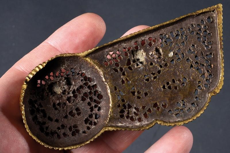 In ottone dorato di forma irregolare, decorato con due draghi riccamente traforati fra volute, le teste in altorilievo. Il bordo decorato a raggi. Tre fori per il fissaggio.