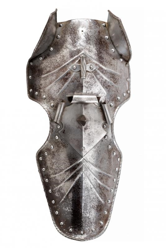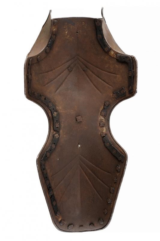 Realizzato in un unico pezzo, con bordi orlati e lavorati a fingere il tortiglione; la parte superiore e quella inferiore entrambe costole in mezzeria e decorate con sei raggi in bassorilievo convergenti al centro. Scudetto con tre lati ripiegati e sormontato da un robusto brocco, in alto una pennacchiera. Due orecchioni rivettati. Il retro con rivetti e resti di coietti.
