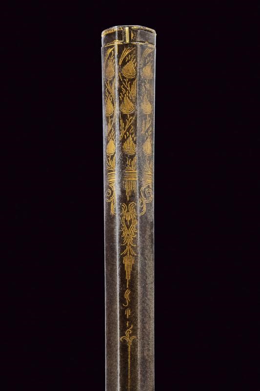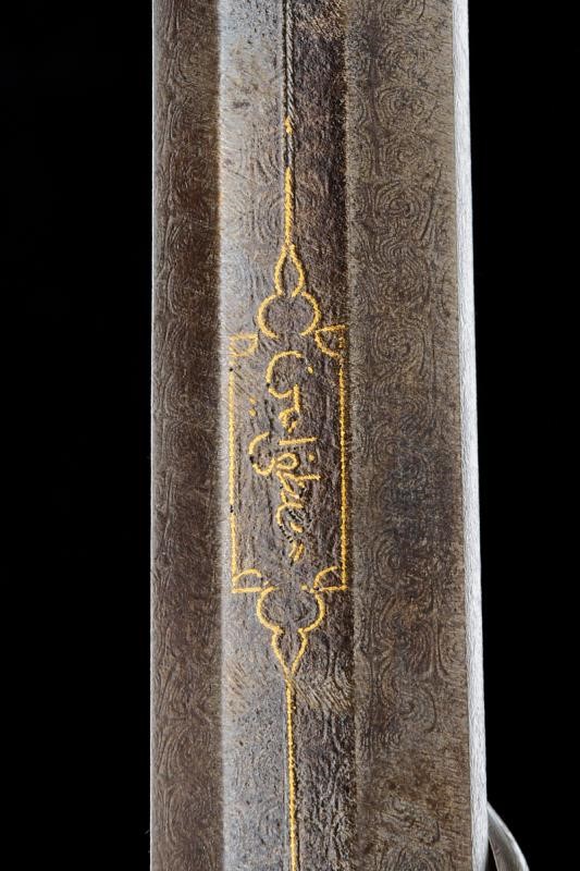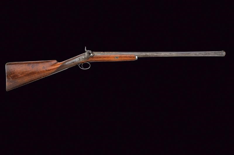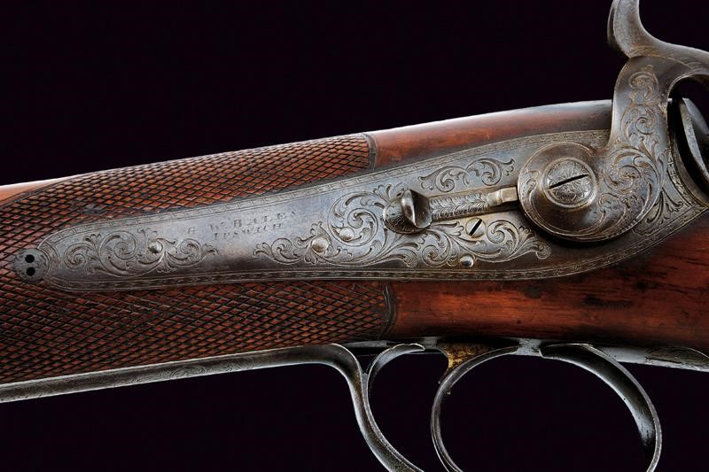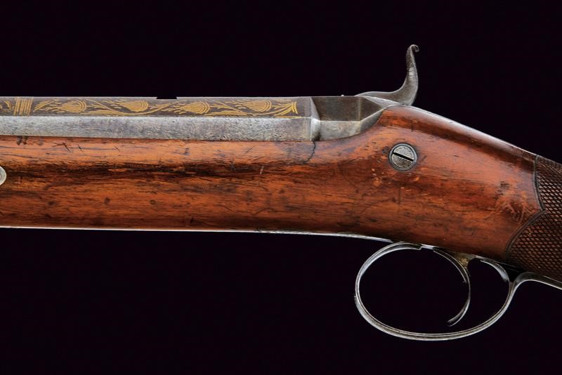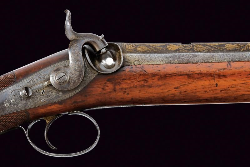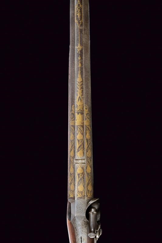 Robusta canna ottagonale in damasco, rigata, ornata al dorso con agemine sul tipo del koftgari a motivi floreali (minime mancanze alla decorazione) presenti in culatta e in volata, al centro una sottile bindella è divisa in due segmenti da un cartiglio centrale con iscrizione in caratteri arabi. In volata è presente il mirino, l'alzo è mancante. Cal. 17 mm. in volata. Il blocco di culatta e il codolo con incisioni a racemi di gusto britannico. Batteria a molla indietro, con meccanica a due scatti ben funzionante. Dotata inoltre di sicura esterna a cursore. Cartella incisa a racemi e firmata "G.W. WALES IPSWICH". Mezza cassa in noce con collo zigrinato. Fornimenti in ferro decorati a racemi. Privo di alloggiamento per la bacchetta.
