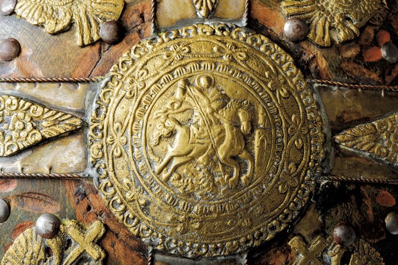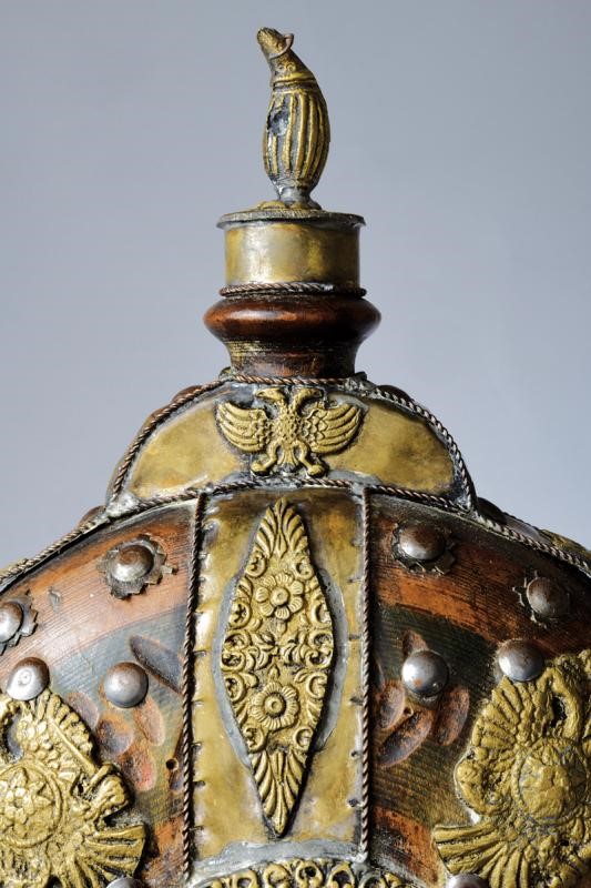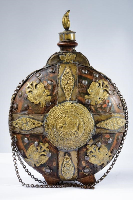 Corpo in legno di forma circolare, leggermente intagliato a brevi sgusci e parzialmente dipinto in policromia. Con numerosi fornimenti in metallo bianco ed ottone disposti a croce: al centro vi è un medaglione effigiante San Giorgio che trafigge il drago, su ciascuna delle quattro sezioni individuate dalla croce si trova una placca ad'aquila bicipite sormontata da croce; la stessa aquila, ma priva di croce, si trova anche alla base del cannello e sul bordo, il quale e totalmente rinforzato da una banda con bordi in filo di rame a spirale. Alla sommità tappo in metallo con testa a mandorla. Ai lati due anelli di sospensione con catena. Alla base quattro piedini triangolari in legno.
