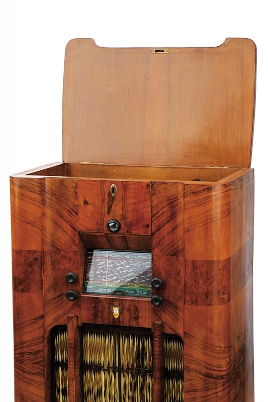 Bel mobile impiallacciato in radica. Fodera dell'altoparlante in tessuto bianco con intreccio di bande in cuoio. Dotata di fonografo. Piatto con marcatura della ditta. Interno con valvole presenti. Due spine differenti. Il mobiletto è stato montato su un supporto ligneo dotato di rotelline per una più agevole collocazione.