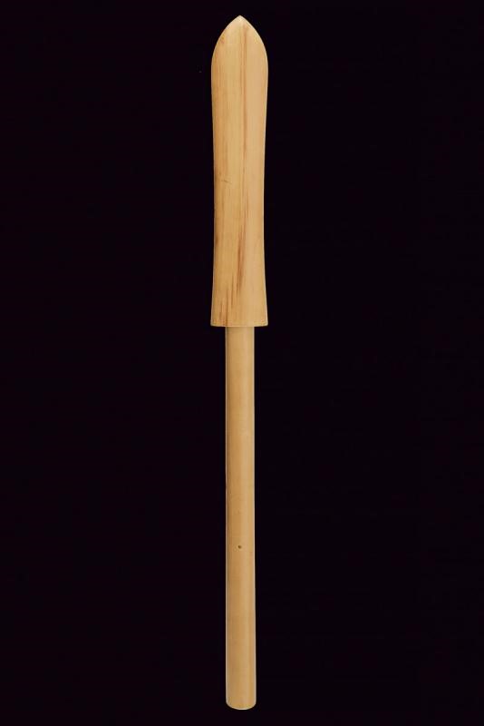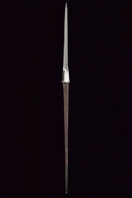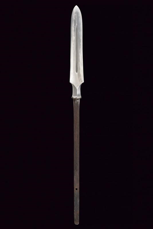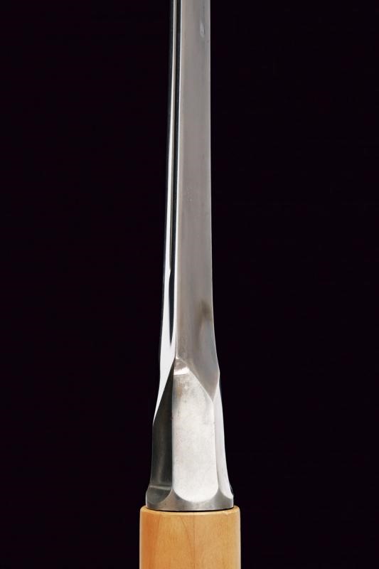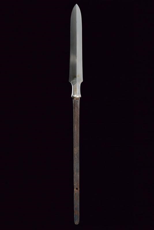 Robusta e pesante cuspide di sezione triangolare con faccia principale piatta e scanalata in mezzeria, la base rastremata e faccettata; lungo nakago di sezione rettangolare, decrescente verso la punta, con un mekugi-ana. In shirasaya.